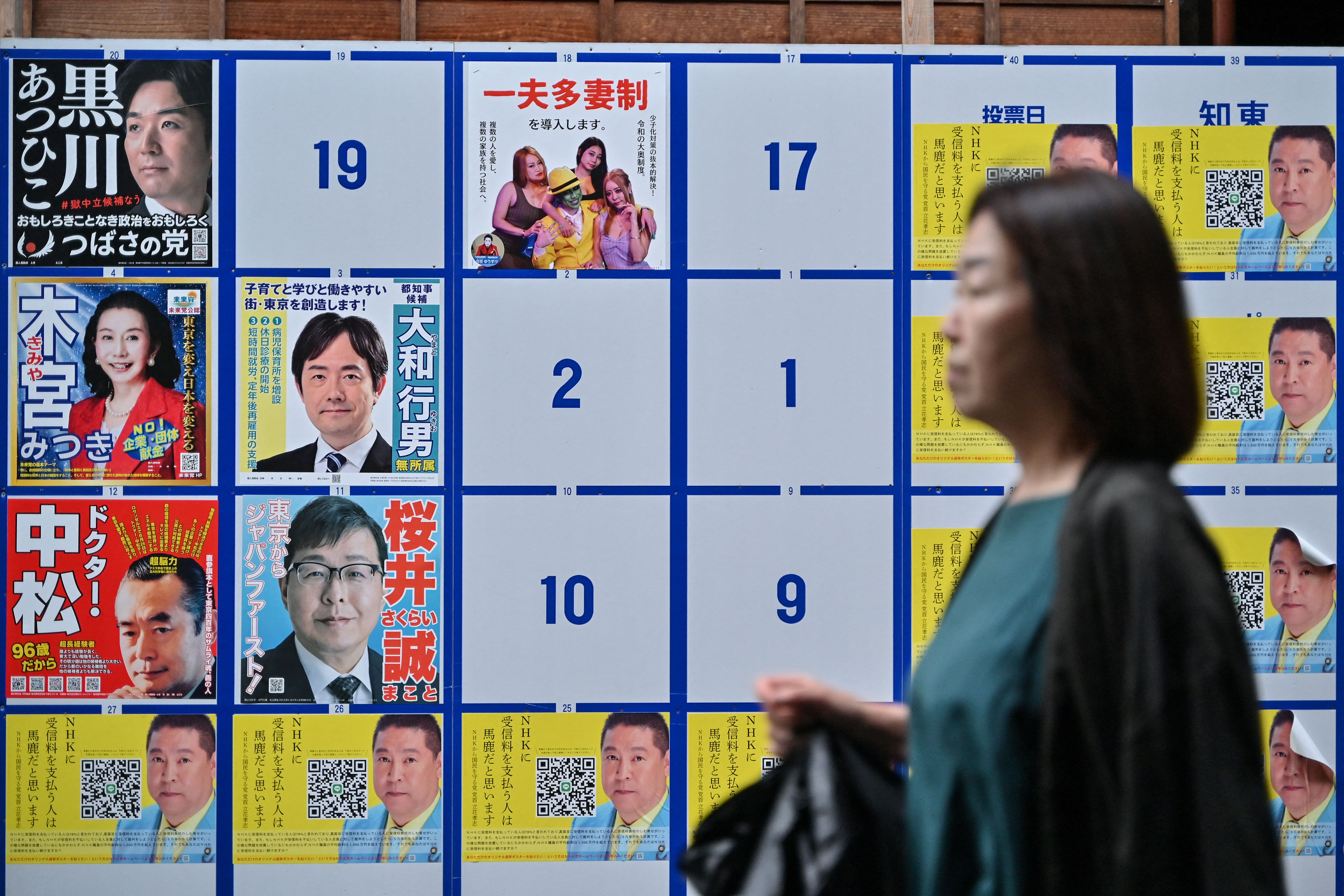 A woman walks past an election poster board displaying various candidates in the upcoming July 7 Tokyo gubernatorial election, along a street in Tokyo on June 23, 2024. (Photo by Richard A. Brooks/AFP Photo)