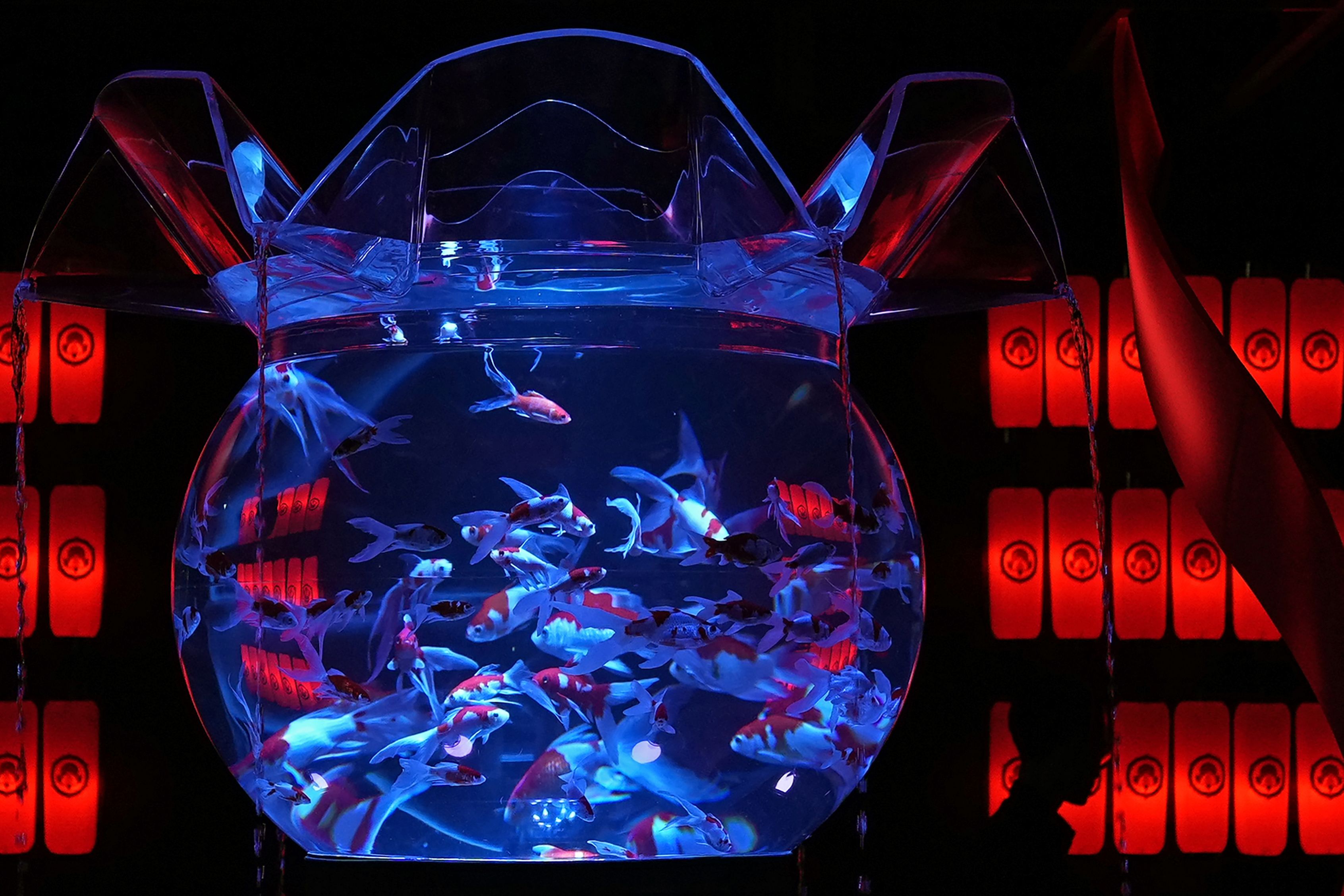 Goldfish swim at Obimai tank during a media event of the exhibition called “Summer Art Aquarium 2024” at a department store at Ginza district of Tokyo, Thursday, June 27, 2024. (Photo by Shuji Kajiyama/AP Photo)