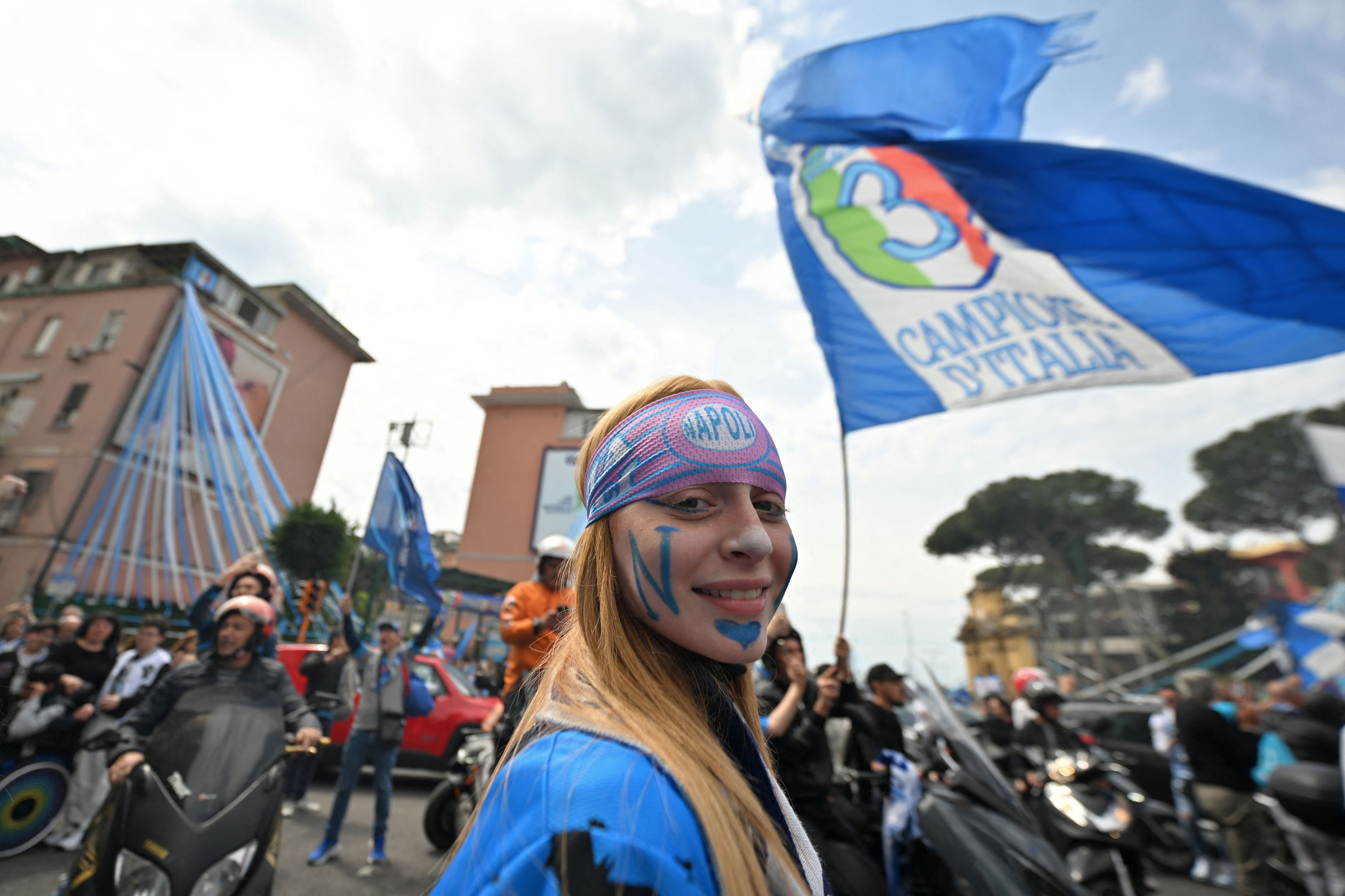 A Napoli fan looks on as Napoli supporters wave team flags outside the Diego-Maradona stadium in Naples on April 30, 2023 prior to the Italian Serie A football match between Napoli and Salernitana. Naples braces for its potential first Scudetto championship win in 33 years. With a 17 point lead at the top of Serie A, southern Italy's biggest club is anticipating its victory in the Scudetto for the first time since 1990. (Photo by Filippo Monteforte/AFP Photo)