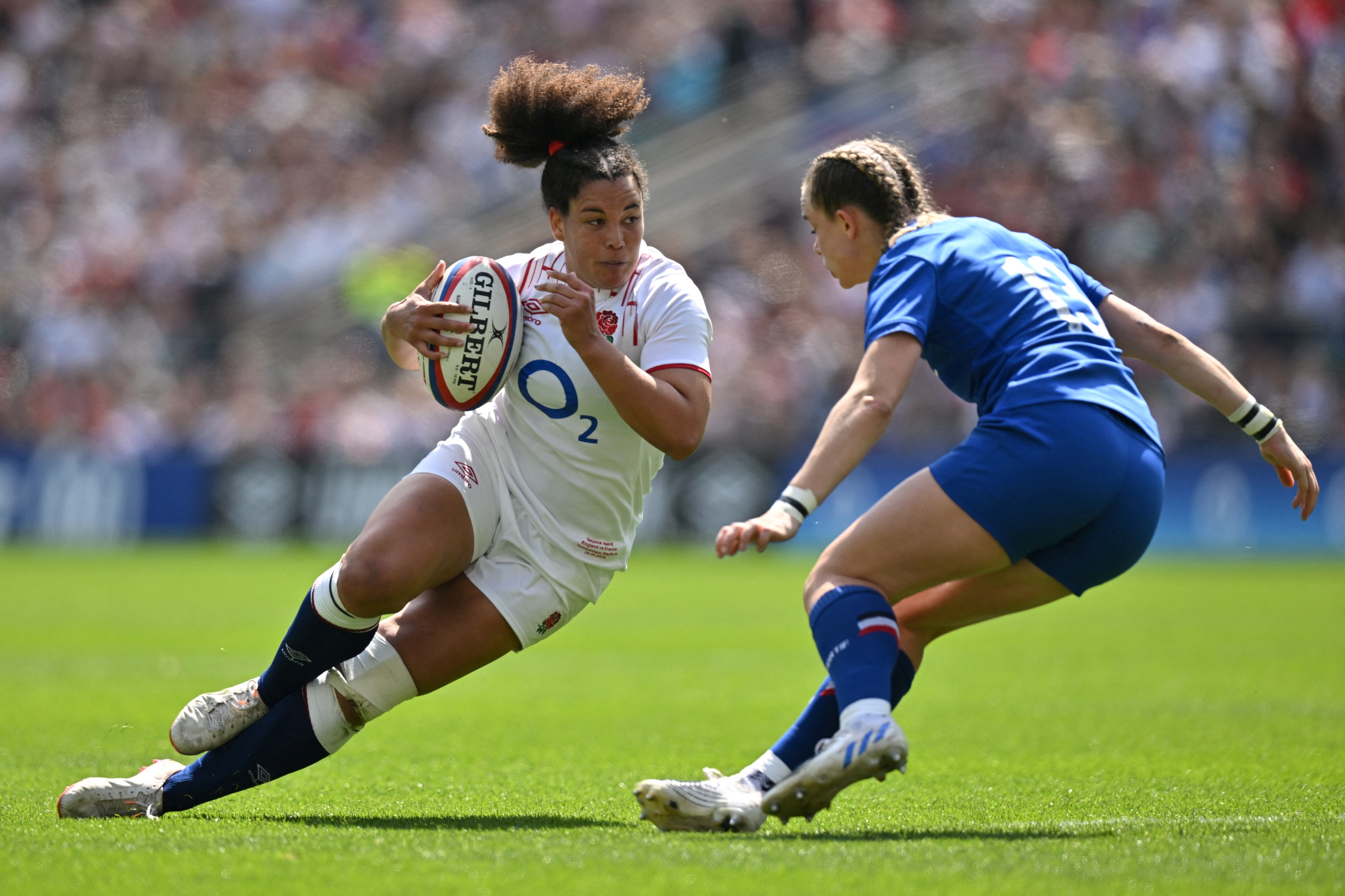 England's centre Tatyana Heard (L) runs with the ball next to France's centre Marine Menager during the Six Nations international women's rugby union match between England and France at Twickenham in south-west London on April 29, 2023. (Photo by Glyn Kirk/AFP Photo)