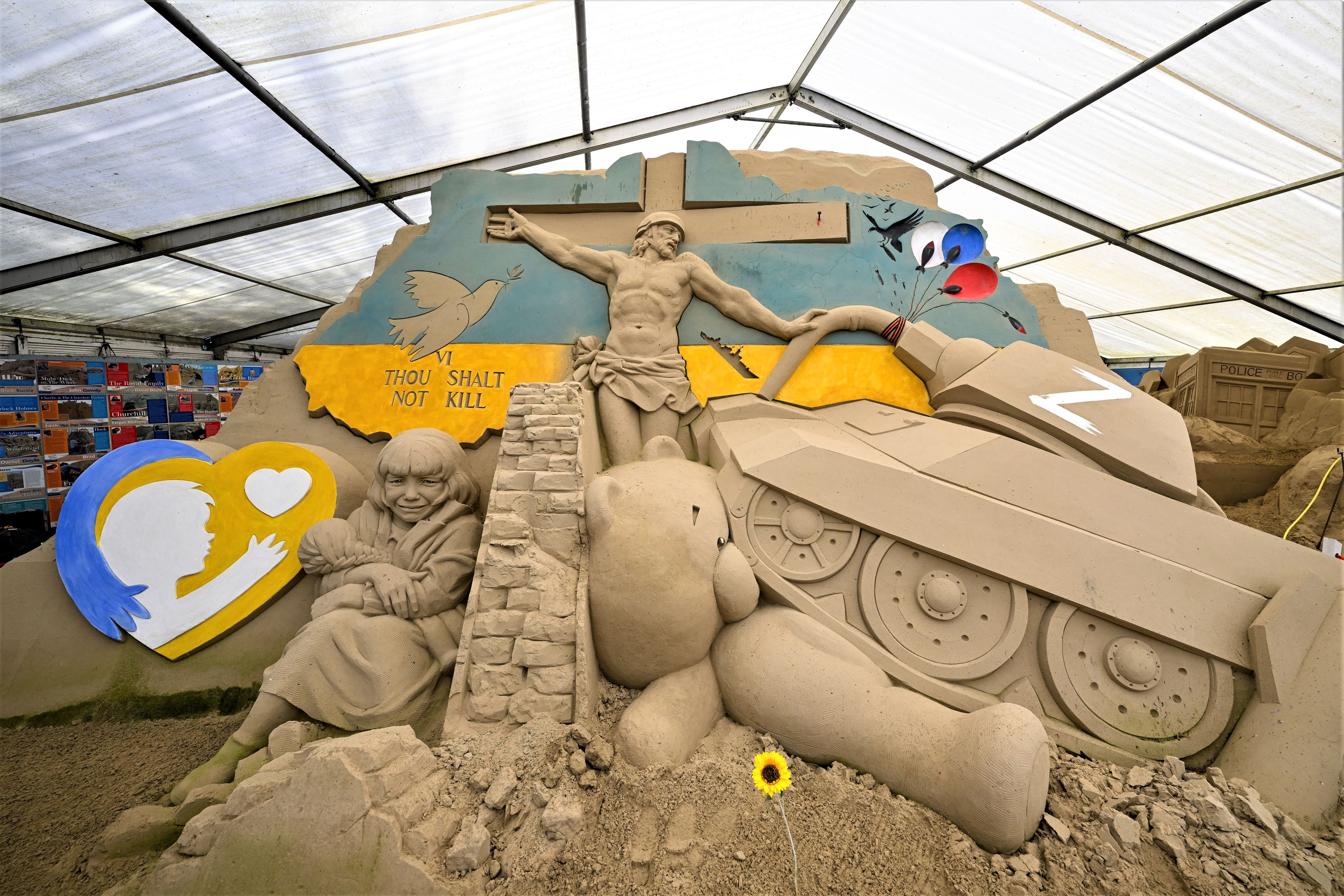 Preparing for the summer season opening this weekend, award-winning Ukrainian Sand Sculptor Slava Borecki's Ukrainian sand sculpture, sculpted at the beginning of the war in Ukraine, remains on display at Weymouth's SandWorld Sculpture Park, on April 06, 2023 in Weymouth, England. (Photo by Finnbarr Webster/Getty Images)