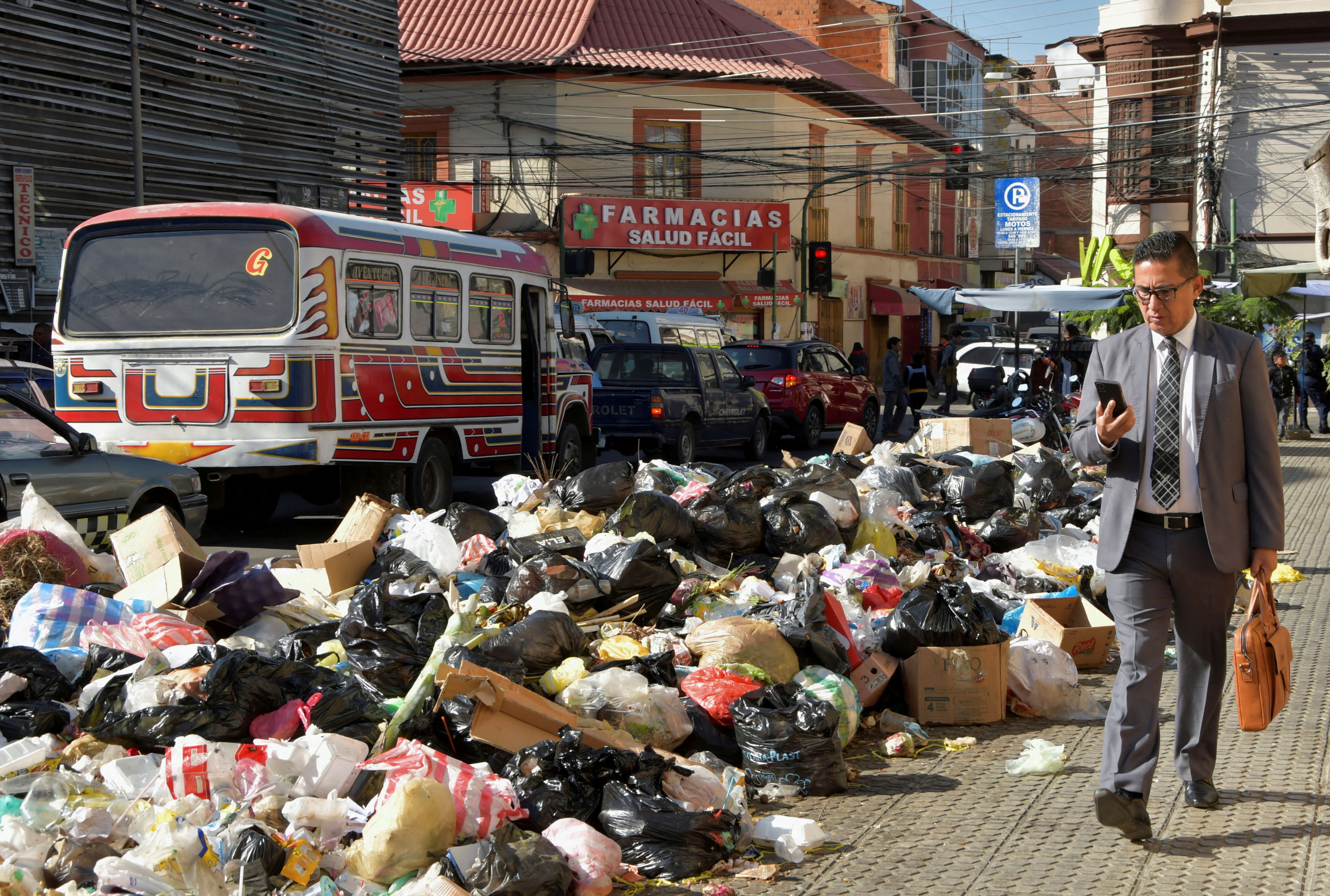 A man walks near garbage accumulated over several days in the streets since residents of the Tamborada neighbourhood have been blocking access to the K'ara K'ara landfill, due to a dispute over land prices with a local university, in Cochabamba, Bolivia on April 24, 2023. (Photo by Patricia Pinto/Reuters)
