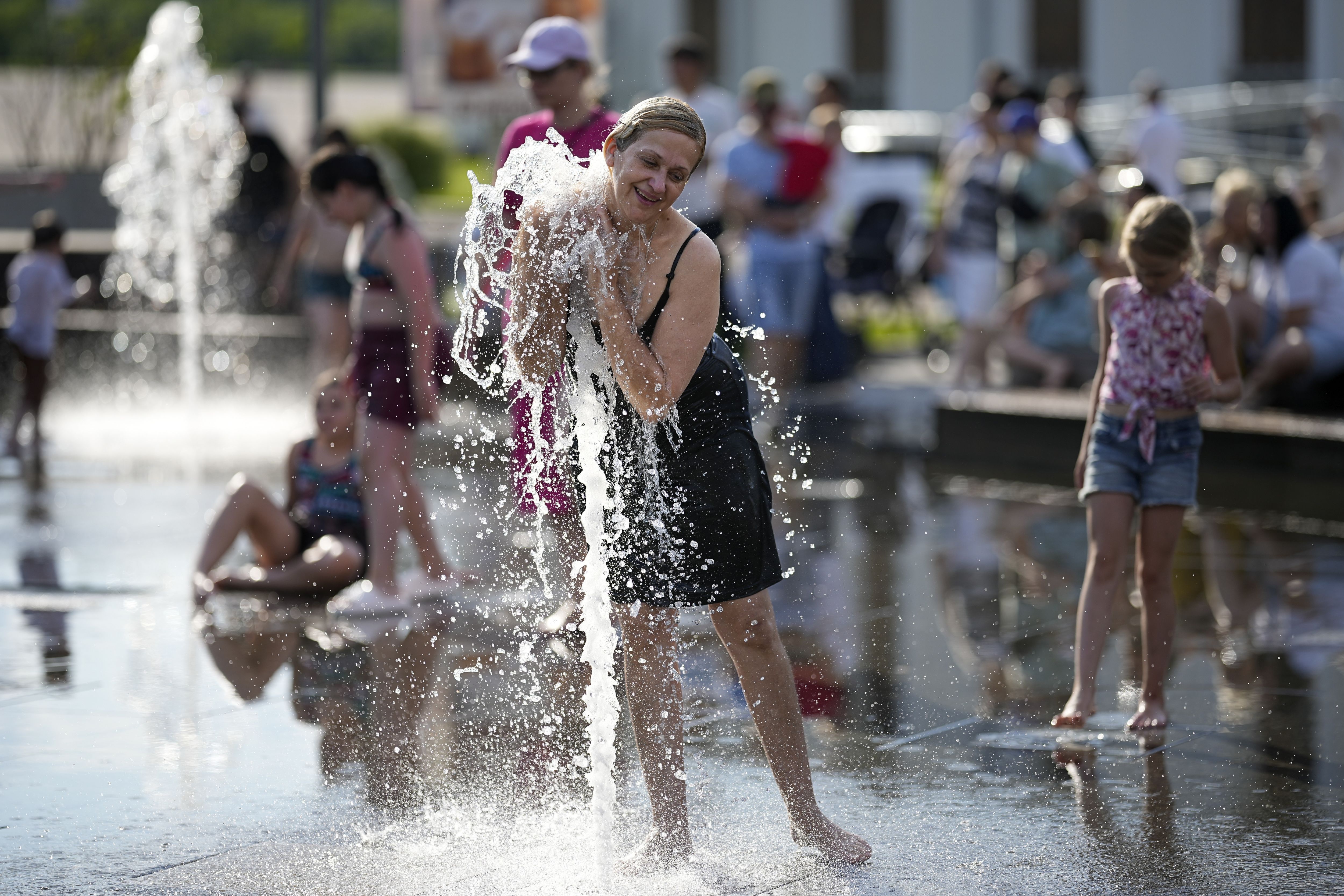 A young woman cools off in a fountain at VDNKh (The Exhibition of Achievements of National Economy) enjoying the warm weather, in Moscow, Russia, on Sunday, June 30, 2024. Warm weather has settled in Moscow with a temperature of 31 Celsius, (87,8 Fahrenheit) and will increase in the coming days. (Photo by Alexander Zemlianichenko/AP Photo)