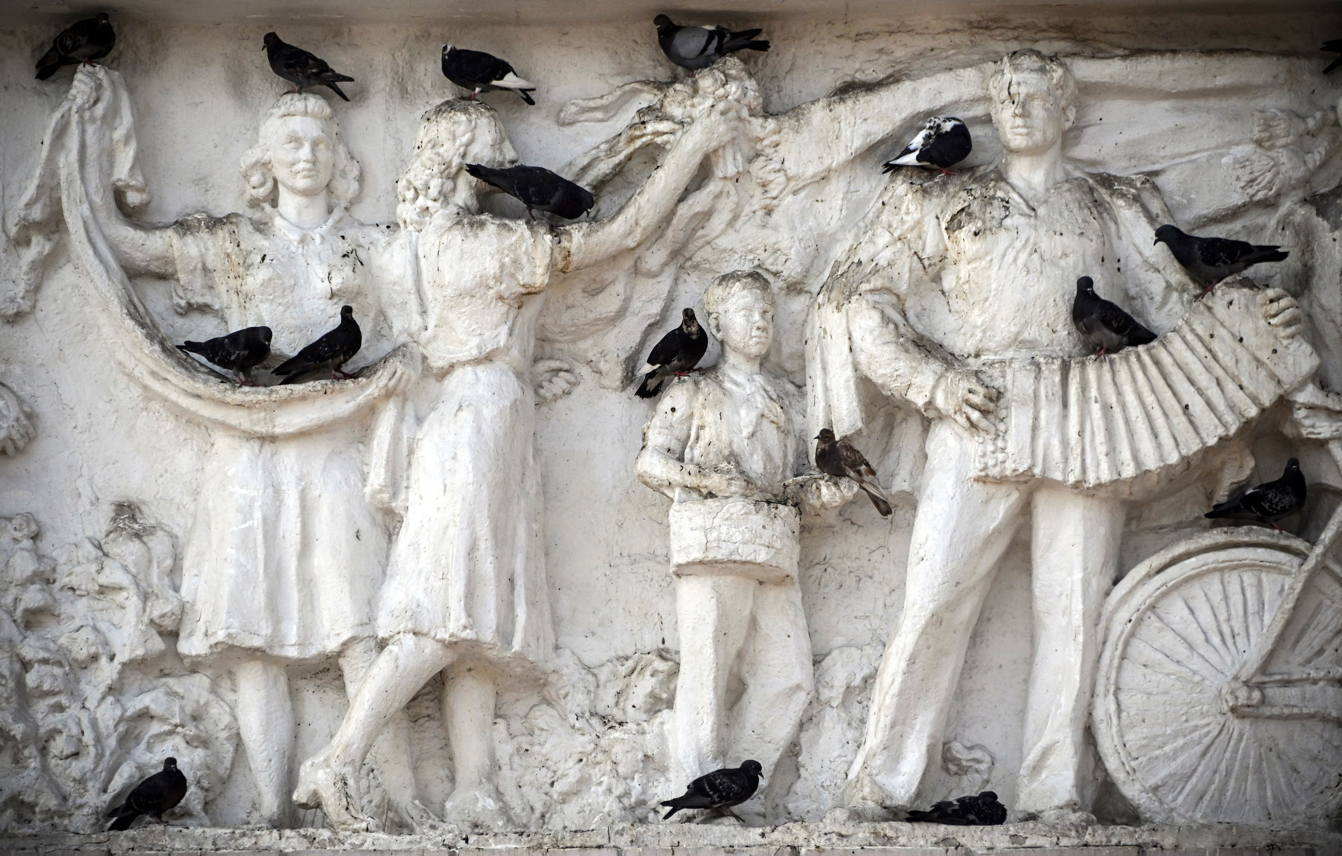 Pigeons sit on a bas-relief depicting a scene from the Soviet life of the middle of the 20-th century located at the entrance to one of metro stations in Moscow on July 2, 2024. (Photo by Alexander Nemenov/AFP Photo)