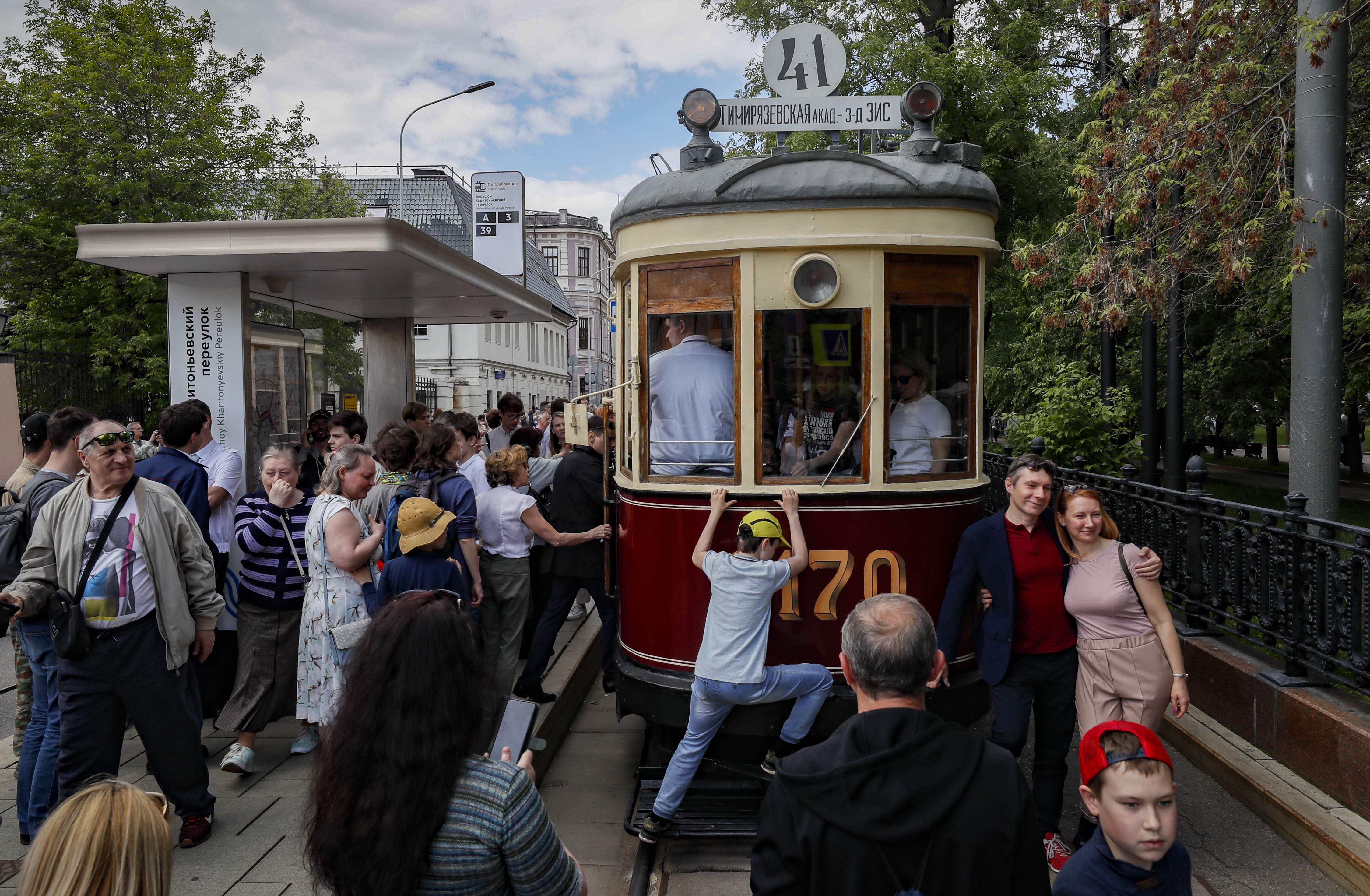 People look at a vintage Kolomna Motor tram car (1926-1935) during the street exhibition Retro Transport Parade at Chistoprudny Boulevard in Moscow, Russia, 04 June 2022. Trams of different generations, MAZ and GAZ trucks from the collection of the Moscow Transport Museum, as well as cars and motorcycles of the Soviet era took part in the Retro Transport Parade. For the first time, exhibits from the museum of the Special Purpose Garage of the Federal Security Service of Russia (FSO) featured in the parade. (Photo by Yuri Kochetkov/EPA/EFE)