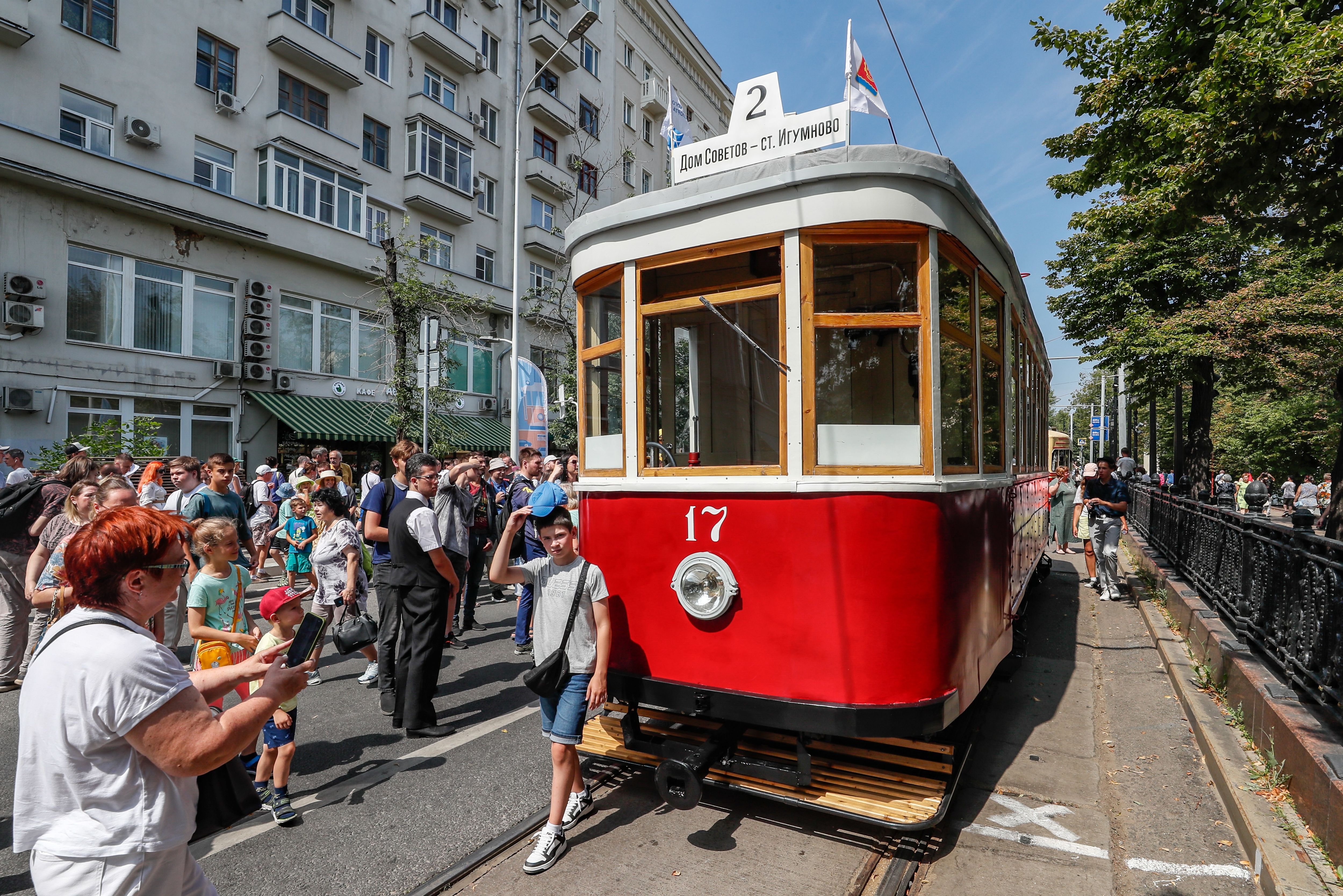People look at the retro tram X (1927-1941) during the street exhibition “Retro Tram Parade” as part of marking the 125th anniversary of the city tramway service in Moscow, Russia on 13 July 2024. (Photo by Yuri Kochetkov/EPA/EFE)