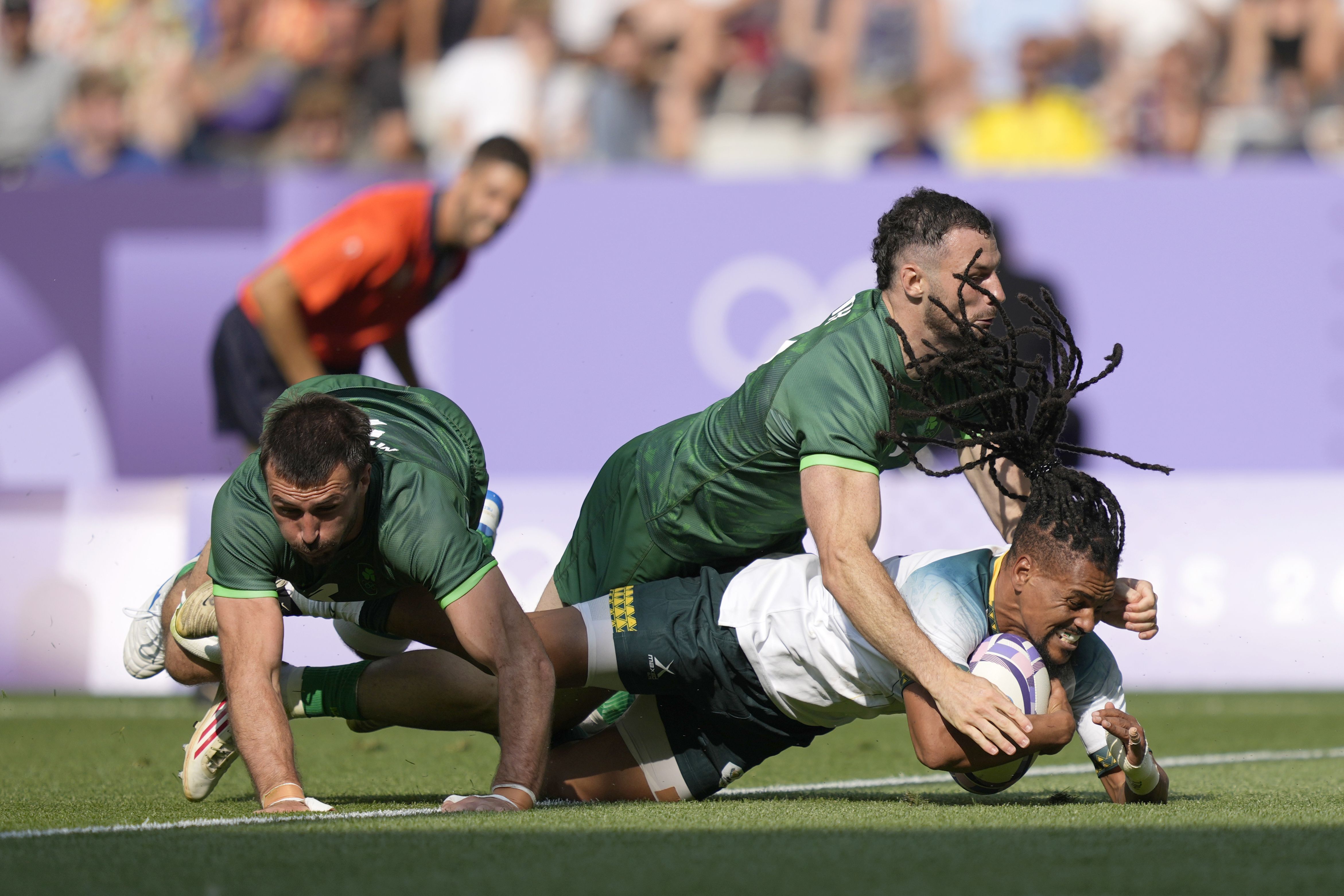 South Africa's Selvyn Davids goes over the line to score a try during the men's Rugby Sevens Pool A match between Ireland and South Africa at the 2024 Summer Olympics, in the Stade de France, Saint-Denis, France, Wednesday, July 24, 2024. (Photo by Tsvangirayi Mukwazhi/AP Photo)