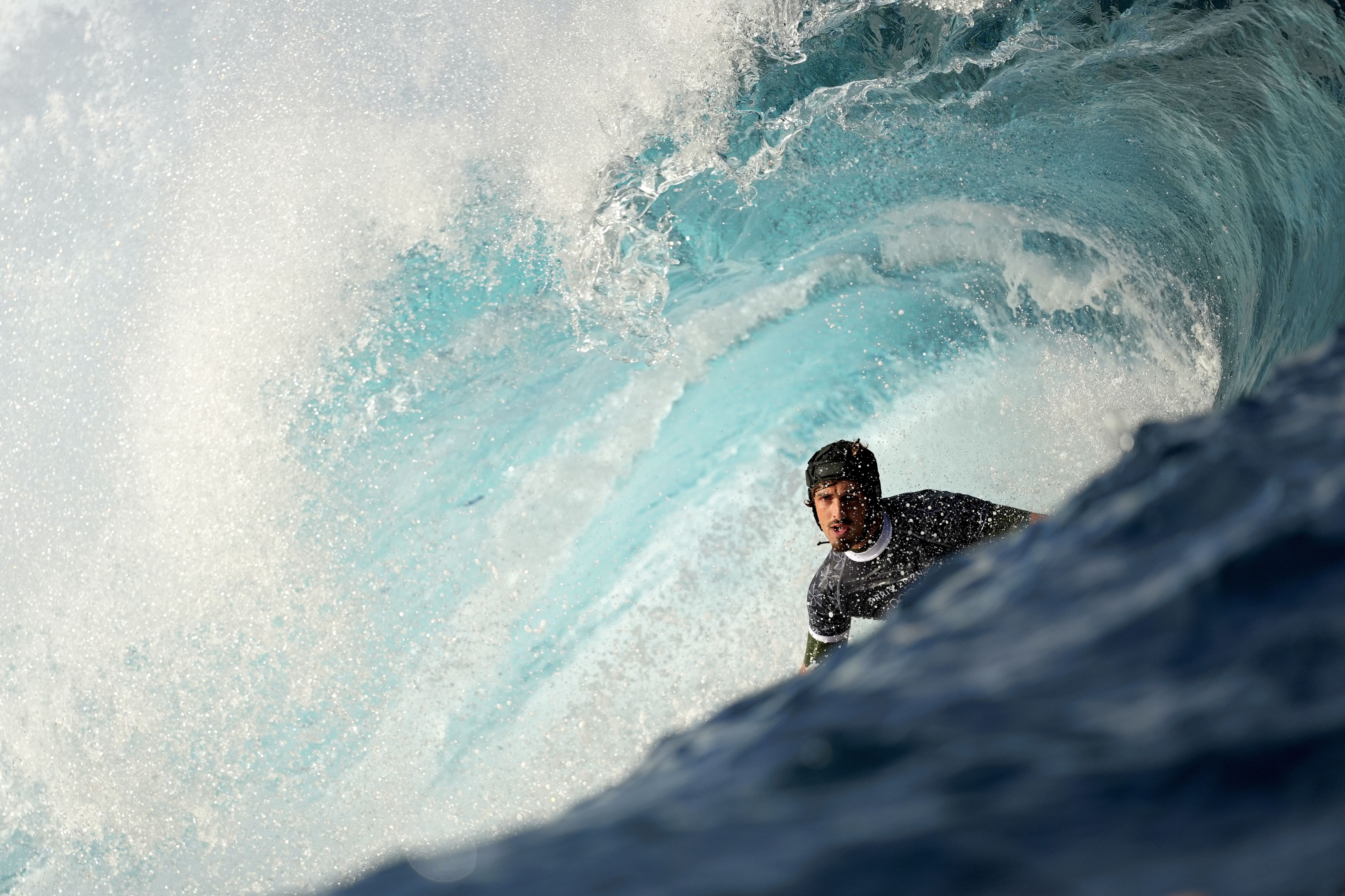 Joao Chianca, of Brazil, surfs on a training day ahead of the 2024 Summer Olympics surfing competition, Tuesday, July 23, 2024, in Teahupo'o, Tahiti. (Photo by Gregory Bull/AP Photo)