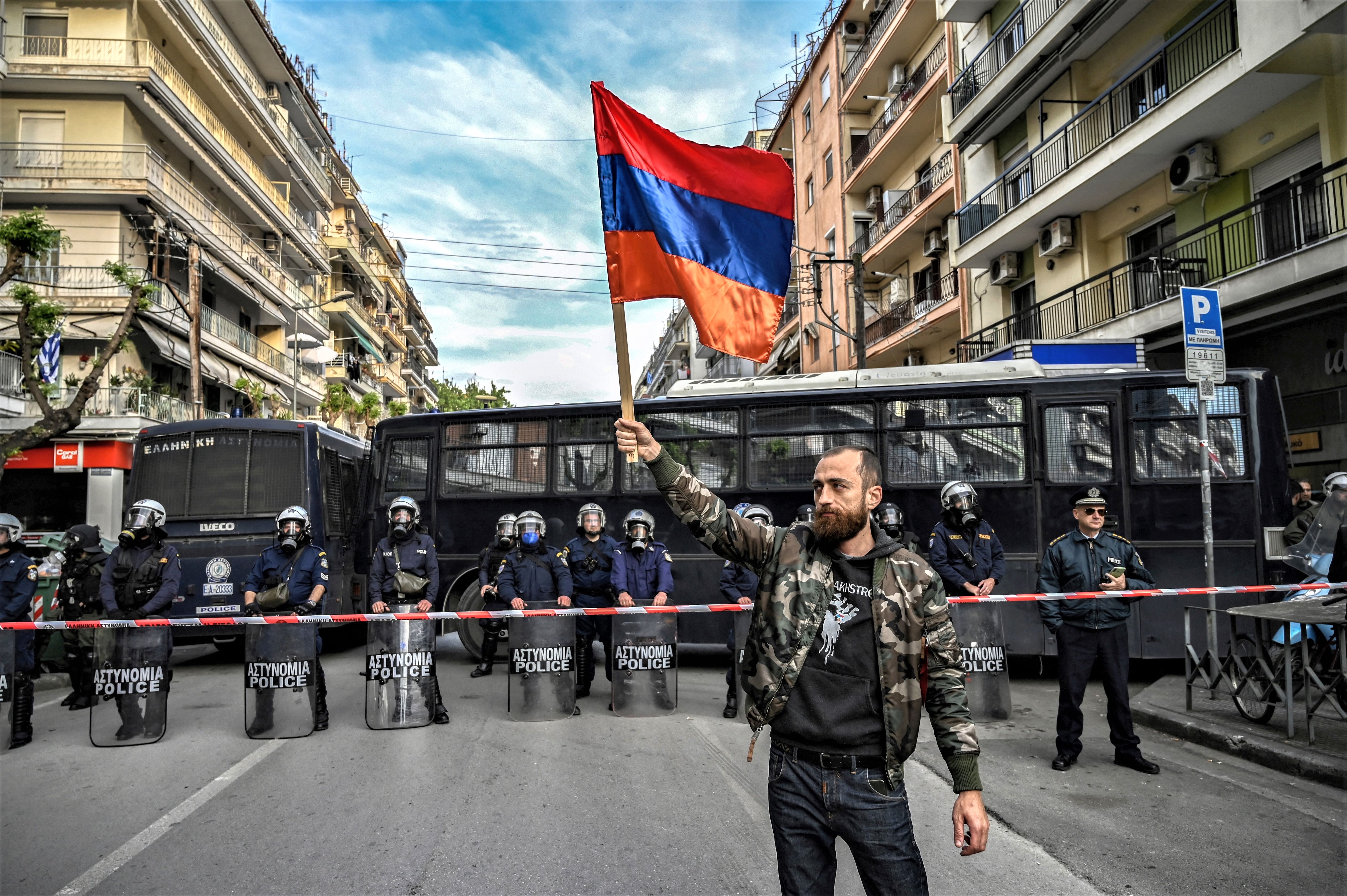 A man holds an Armenian flag in front of the anti-riot police during a rally outside the Turkish consulate to commemorate the 108th anniversary of the Armenian genocide, in Thessaloniki, on April 24, 2023. Armenians mark the 108th anniversary of the massacres in which they say some 1.5 million ethnic Armenians were killed during World War I as the Ottoman Empire collapsed. Armenians have long sought to have the killings internationally recognised as a genocide, with the support of many other countries, but this has been fiercely rejected by Turkey. (Photo by Sakis Mitrolidis/AFP Photo)