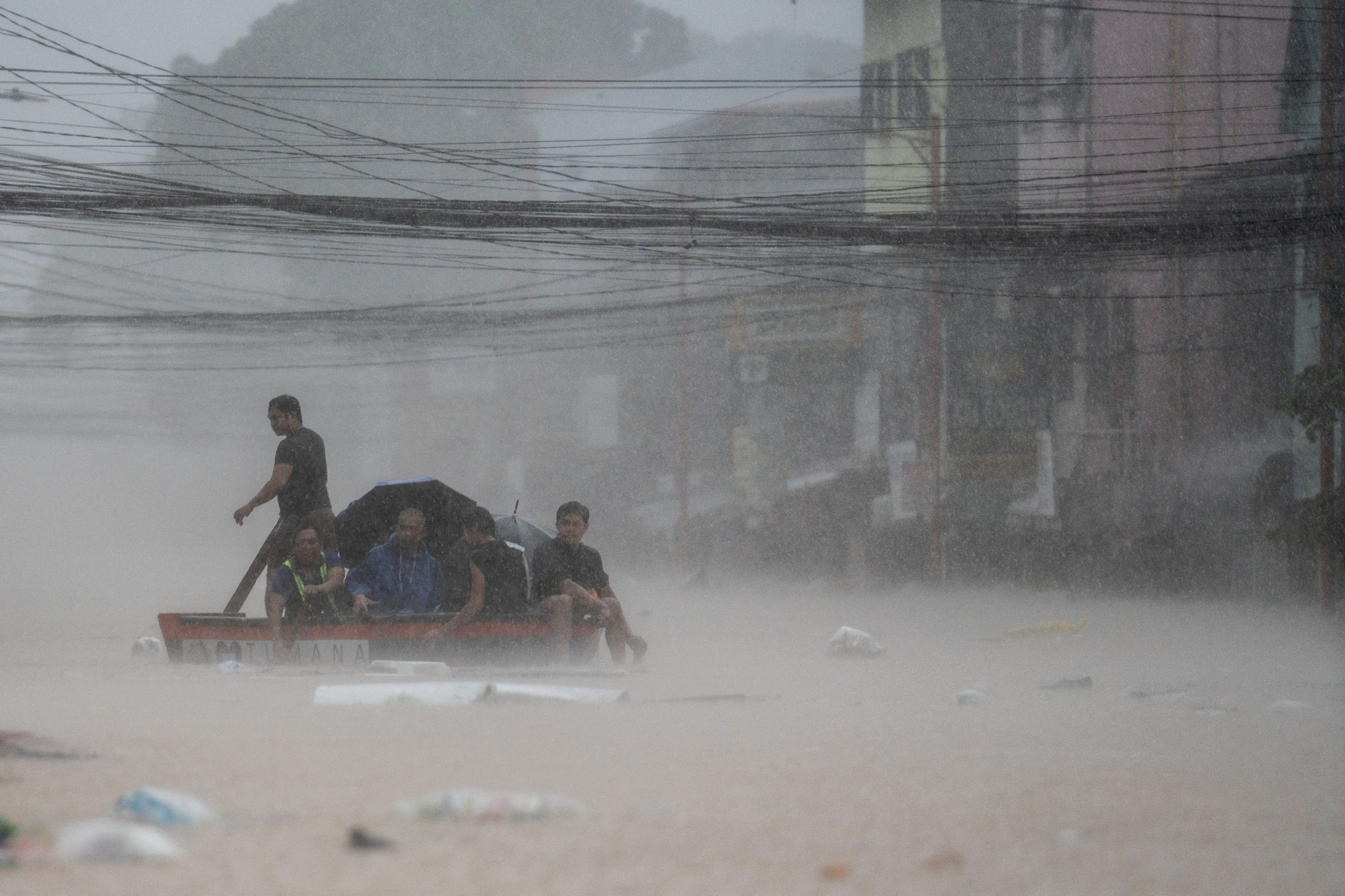 Rescuers assist residents on a boat along a flooded road following heavy rains brought by Typhoon Gaemi, in Marikina City, Metro Manila, Philippines, on July 24, 2024. (Photo by Lisa Marie David/Reuters)