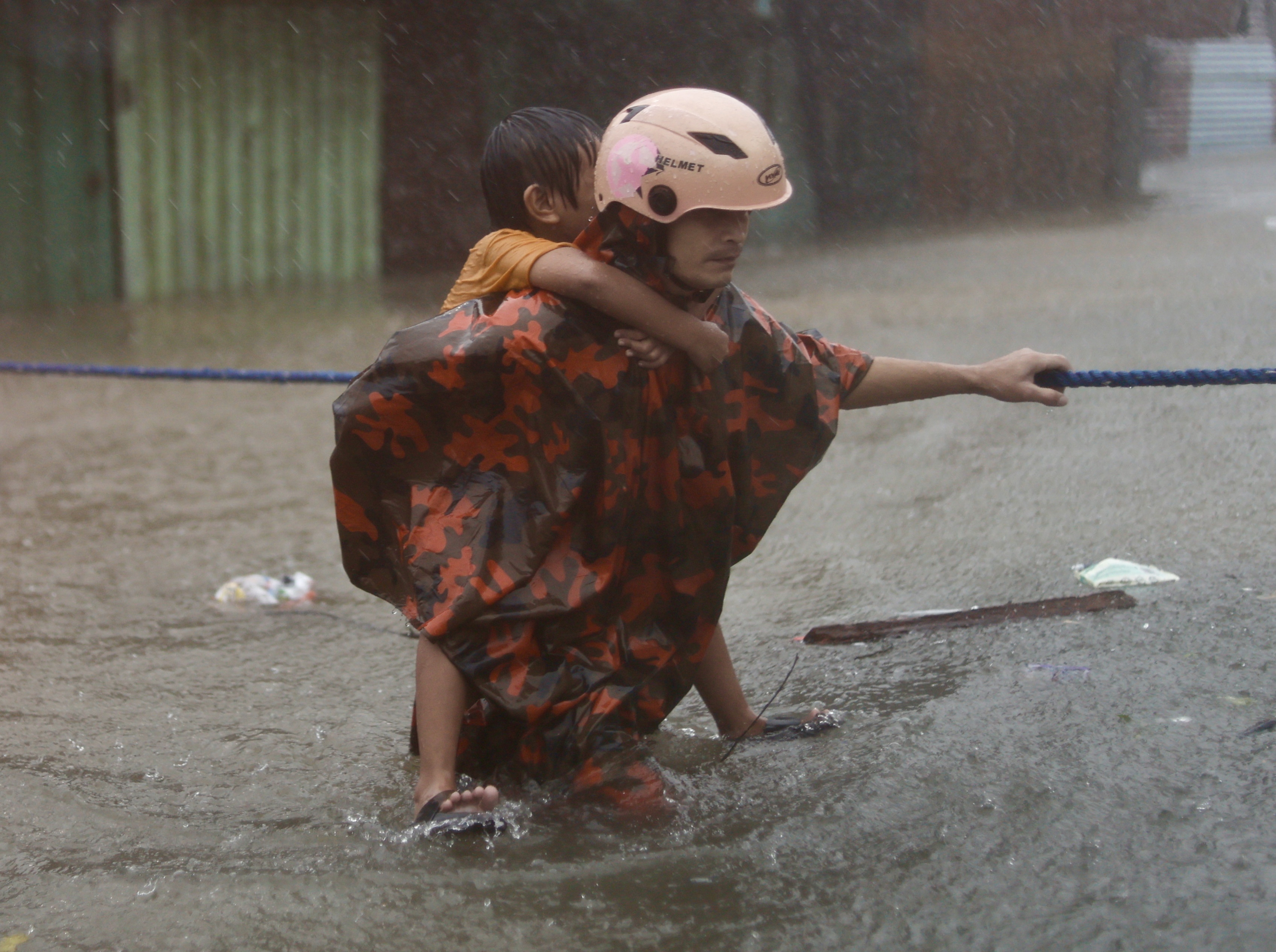 A rescuer carries a boy as they wade on rising floodwaters in Marikina city, Metro Manila, Philippines, 24 July 2024. (Photo by Francis R. Malasig/EPA/EFE)