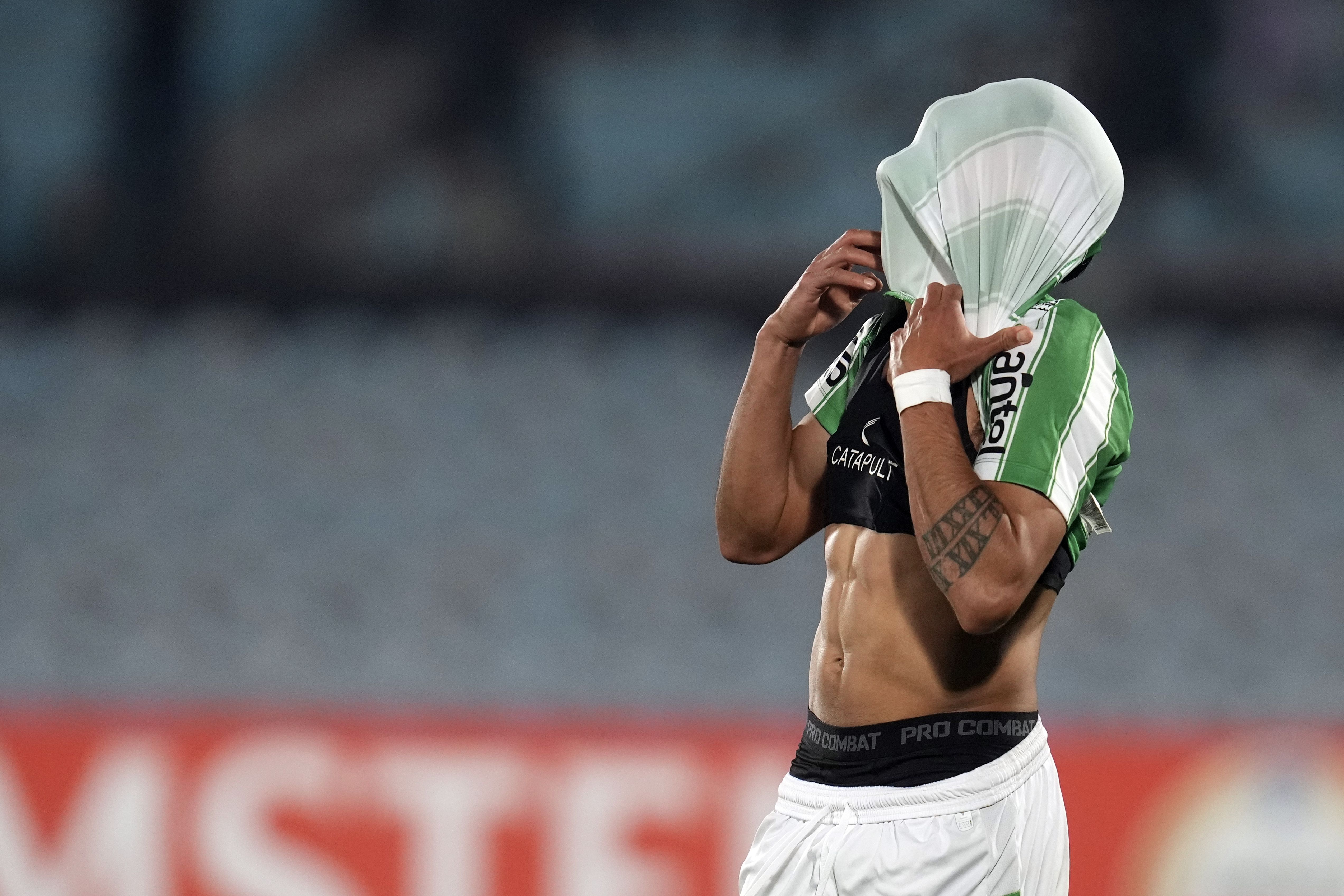 Lucas Rodriguez of Uruguay's Racing reacts after missing a penalty during a Copa Sudamericana playoffs soccer match against Chile's Huachipato at Centenario stadium in Montevideo, Uruguay, Tuesday, July 23, 2024. (Photo by Matilde Campodonico/AP Photo)