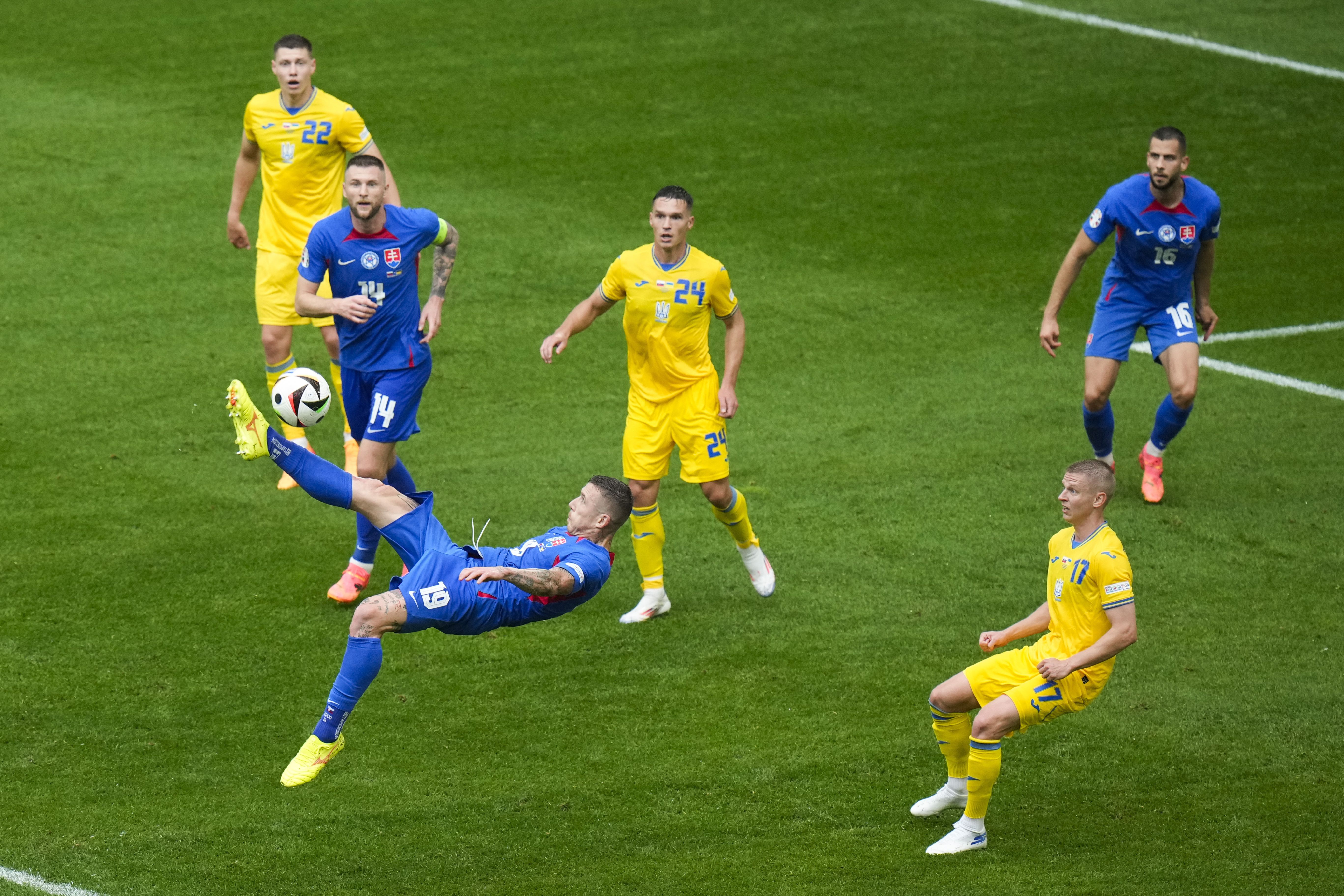 Slovakia's Juraj Kucka, bottom left, shoots during a Group E match between Slovakia and Ukraine at the Euro 2024 soccer tournament in Duesseldorf, Germany, Friday, June 21, 2024. (Photo by Alessandra Tarantino/AP Photo)