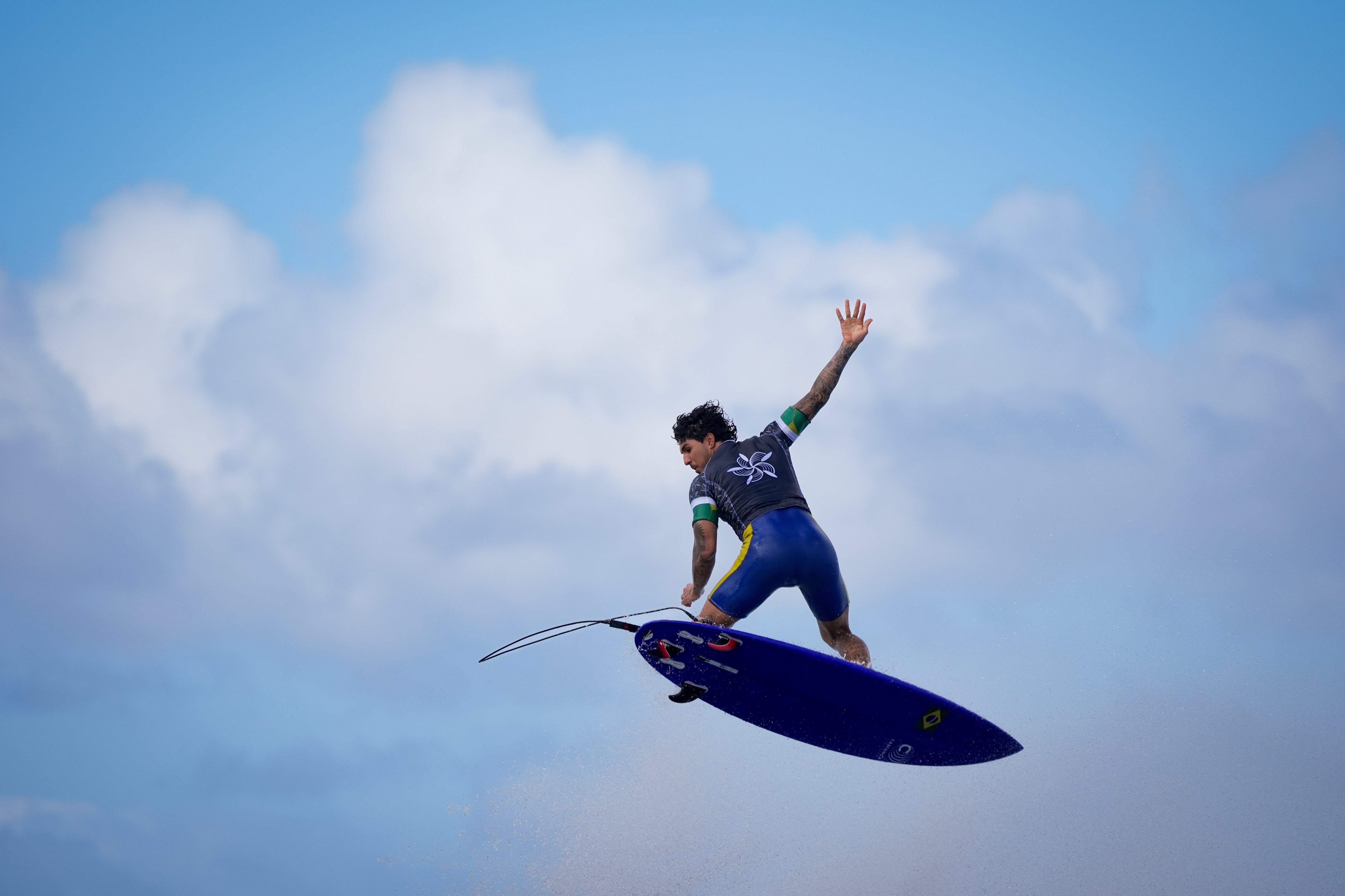 Gabriel Medina, of Brazil, performs an aerial move as he surfs during a training day ahead the 2024 Summer Olympics surfing competition Wednesday, July 24, 2024, in Teahupo'o, Tahiti. (Photo by Gregory Bull/AP Photo)