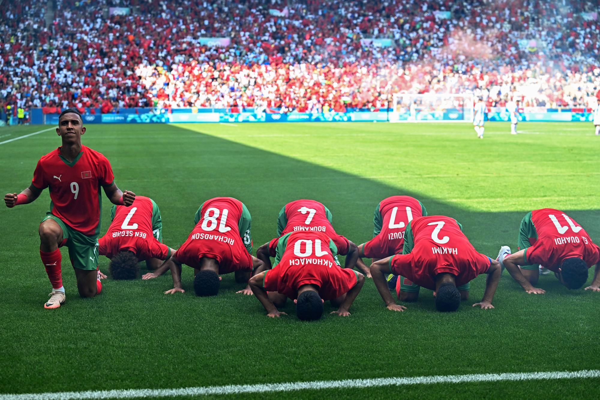 Morocco's forward #09 Soufiane Rahimi (L) kneels as he celebrates after scoring his team's first goal, as his teammates touch their forehead to the ground in the men's group B football match between Argentina and Morocco during the Paris 2024 Olympic Games at the Geoffroy-Guichard Stadium in Saint-Etienne on July 24, 2024. (Photo by Arnaud Finistre/AFP Photo)