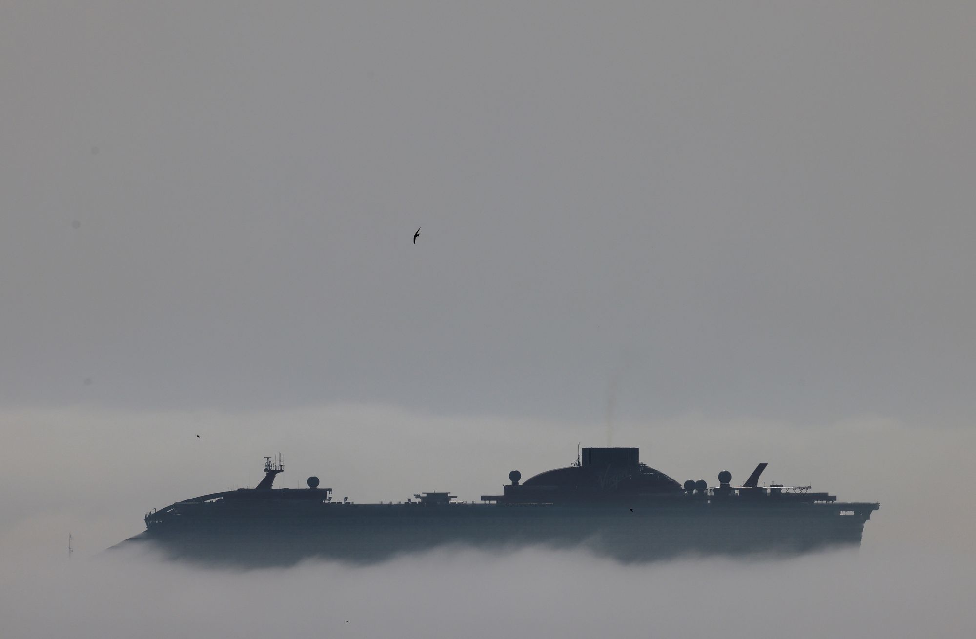 A cruise ship is seen through the fog outside the port in Larnaca, Cyprus, on April 4, 2024. (Photo by Yiannis Kourtoglou/Reuters)