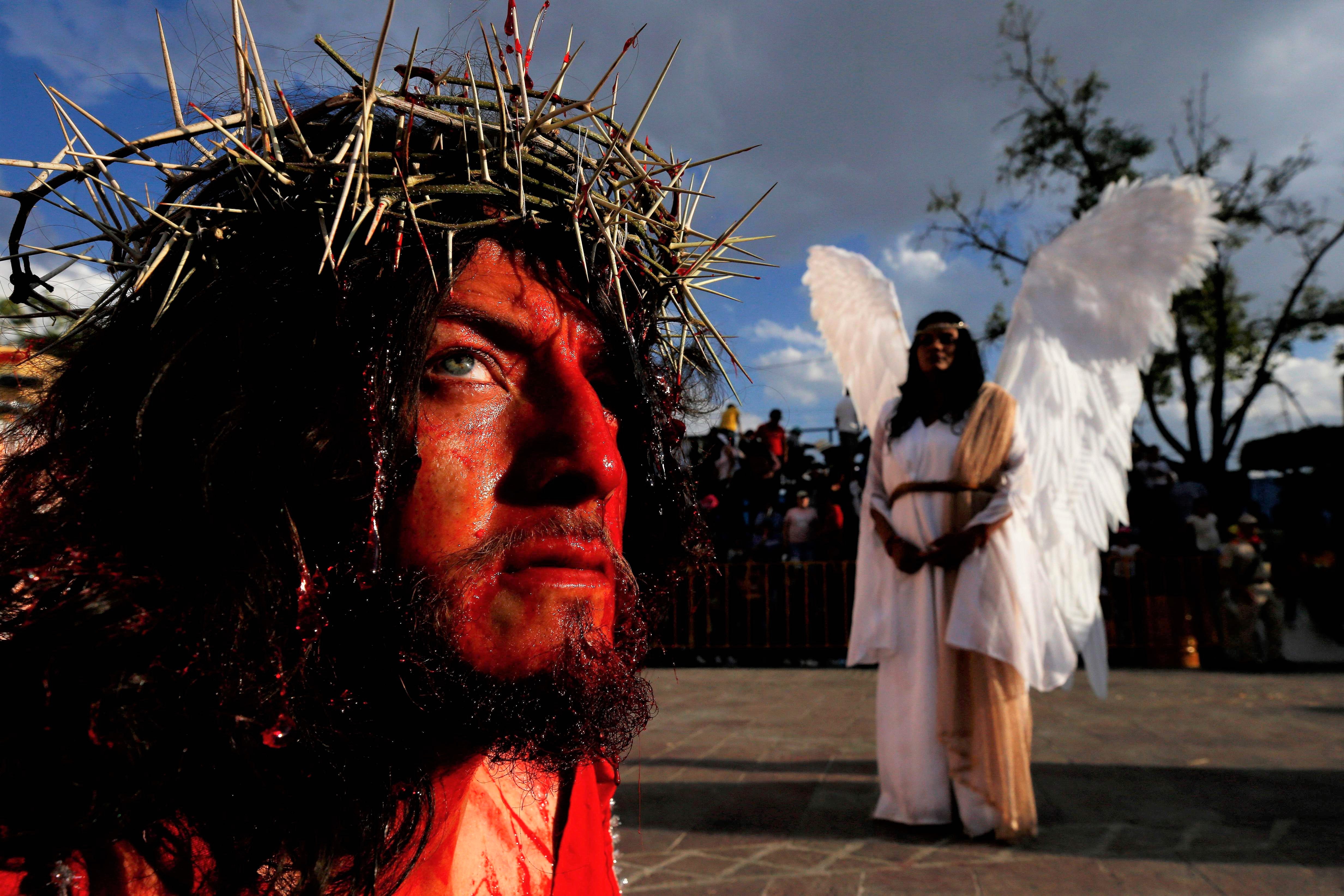 People take part in a performance of “The Passion of Jesus” on Good Friday in San Pedro Tlaquepaque, Mexico on April 7, 2023. (Photo by Ulises Ruiz/AFP Photo)