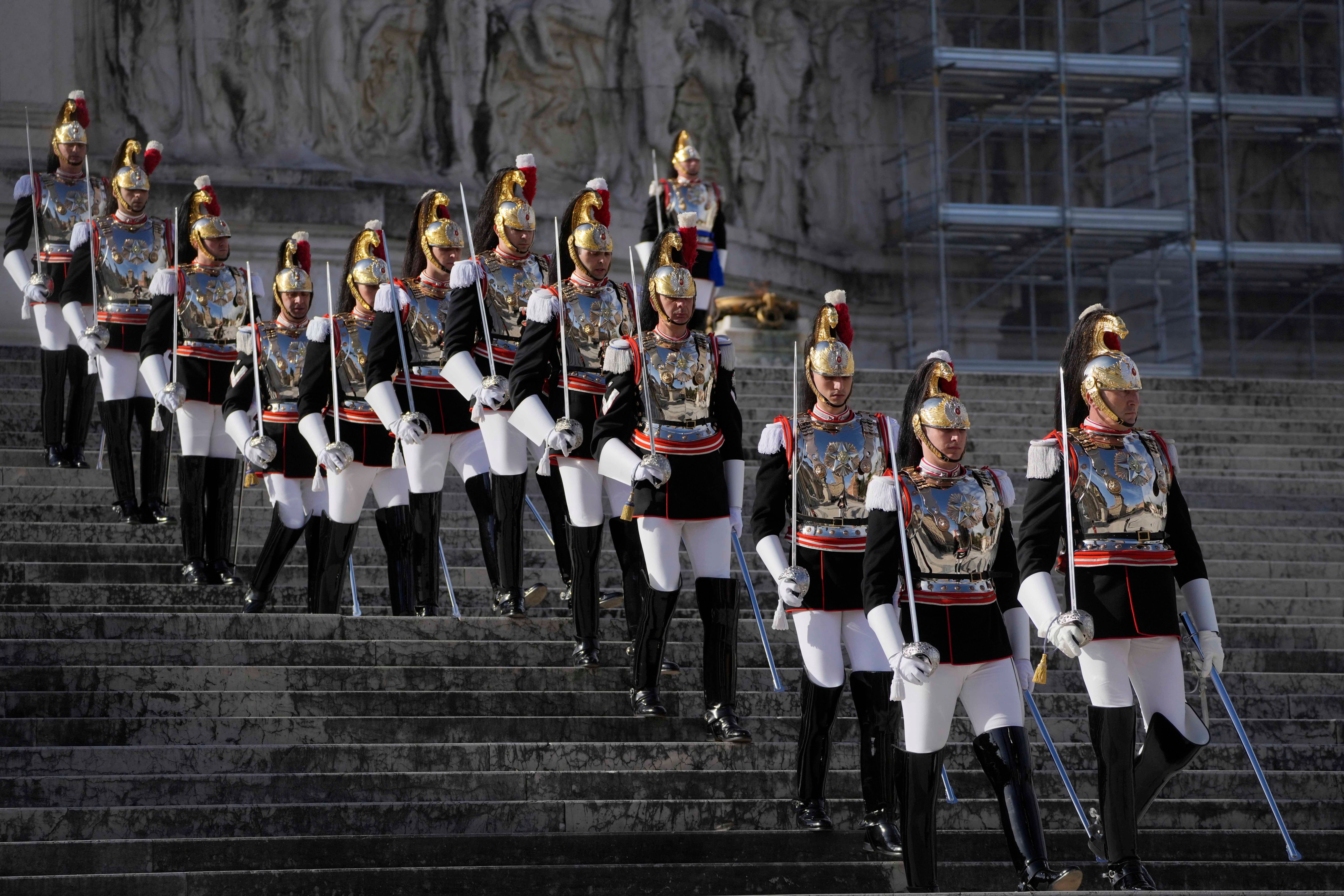 Cuirassier presidential guards descend the steps of the monument to the unknown soldier during a ceremony to mark Italy's Liberation day, in Rome, Tuesday, April 25, 2023. The anniversary marks the day in 1945 when the Italian resistance movement proclaimed an insurgency as the Allies were pushing German forces out of the peninsula. (Photo by Gregorio Borgia/AP Photo)