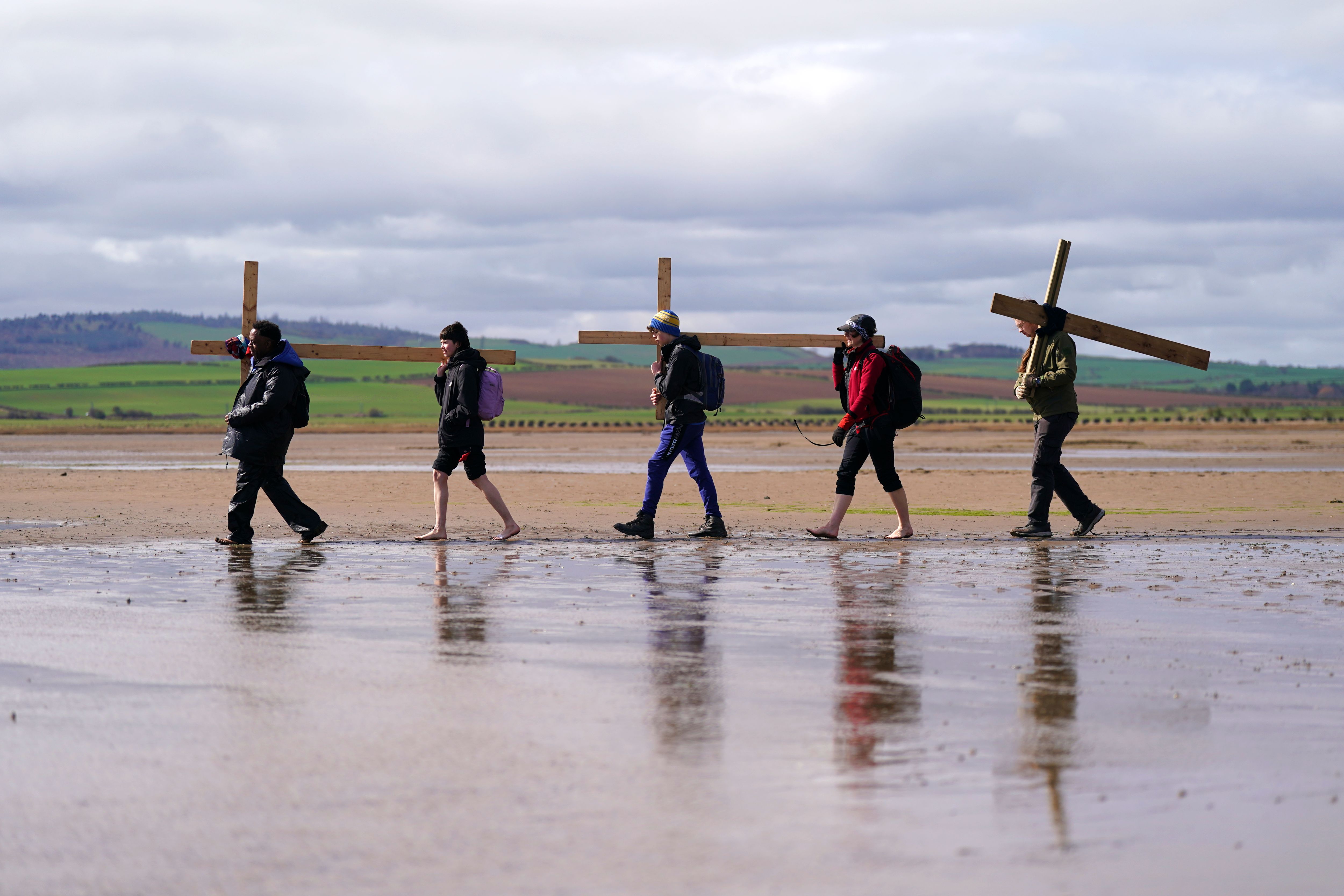 Pilgrims celebrate Easter by carrying wooden crosses as they walk over the tidal causeway to Lindisfarne during the final leg of their annual Good Friday pilgrimage on April 7, 2023 in Berwick-upon-Tweed, England. Pilgrims annually celebrate Easter by crossing at low tide to Lindisfarne, a trek that follows a walk of between 70 to 120 miles in the days leading up to Good Friday. Lindisfarne has become known as Holy Island because of the part it played in the story of bringing the Christian gospel to England. In the 7th Century, King Oswald of Northumbria granted Lindisfarne to Aidan, a monk and missionary, so that he could establish a monastery modelled on one in which he lived on the island of Iona. (Photo by Ian Forsyth/Getty Images)