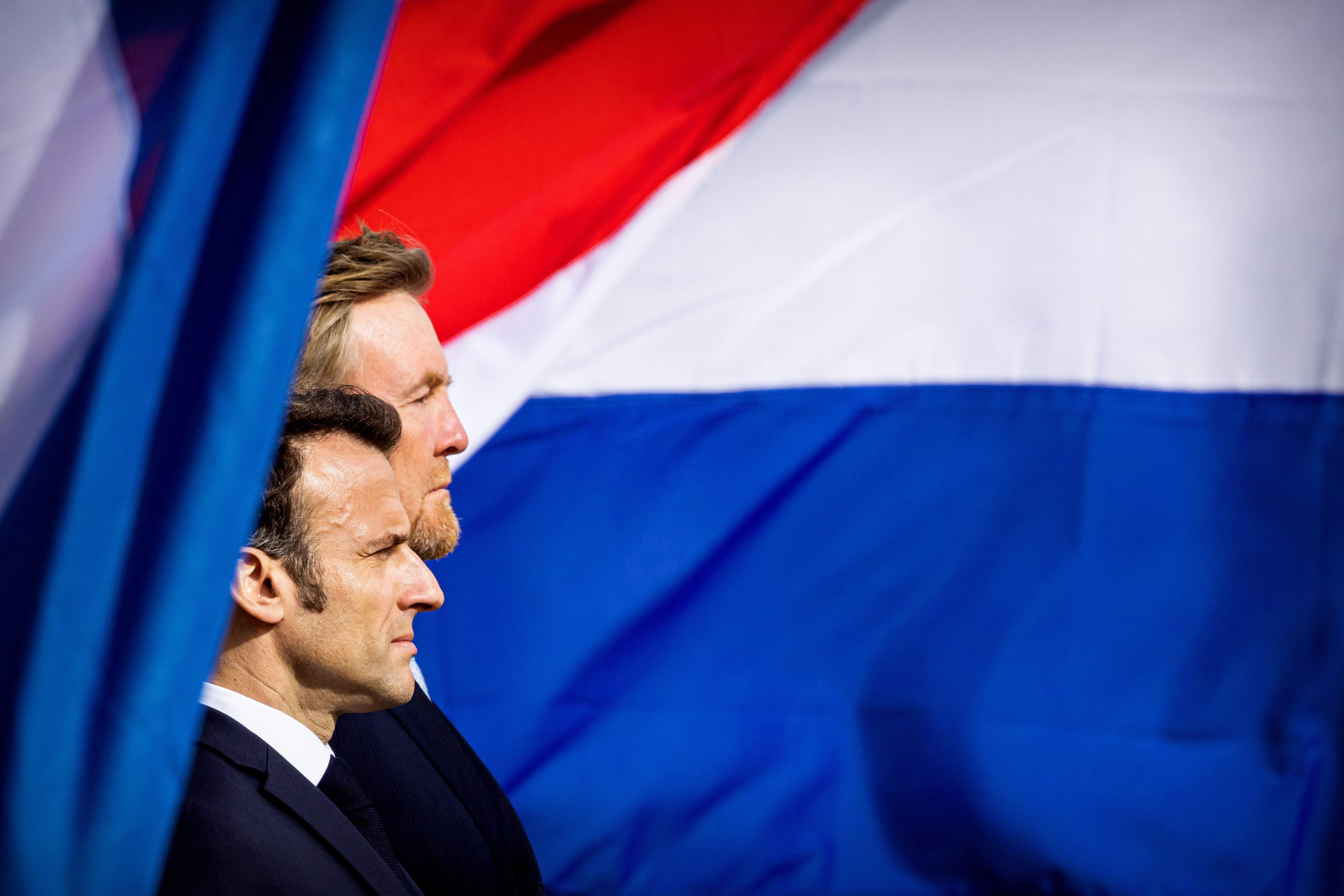King Willem-Alexander of The Netherlands welcomes French President Emmanuel Macron with an official welcome ceremony at the Royal Palace on April 11, 2023 in Amsterdam, Netherlands. The French president is in The Netherlands for a two day state visit. (Photo by Patrick van Katwijk/Getty Images)