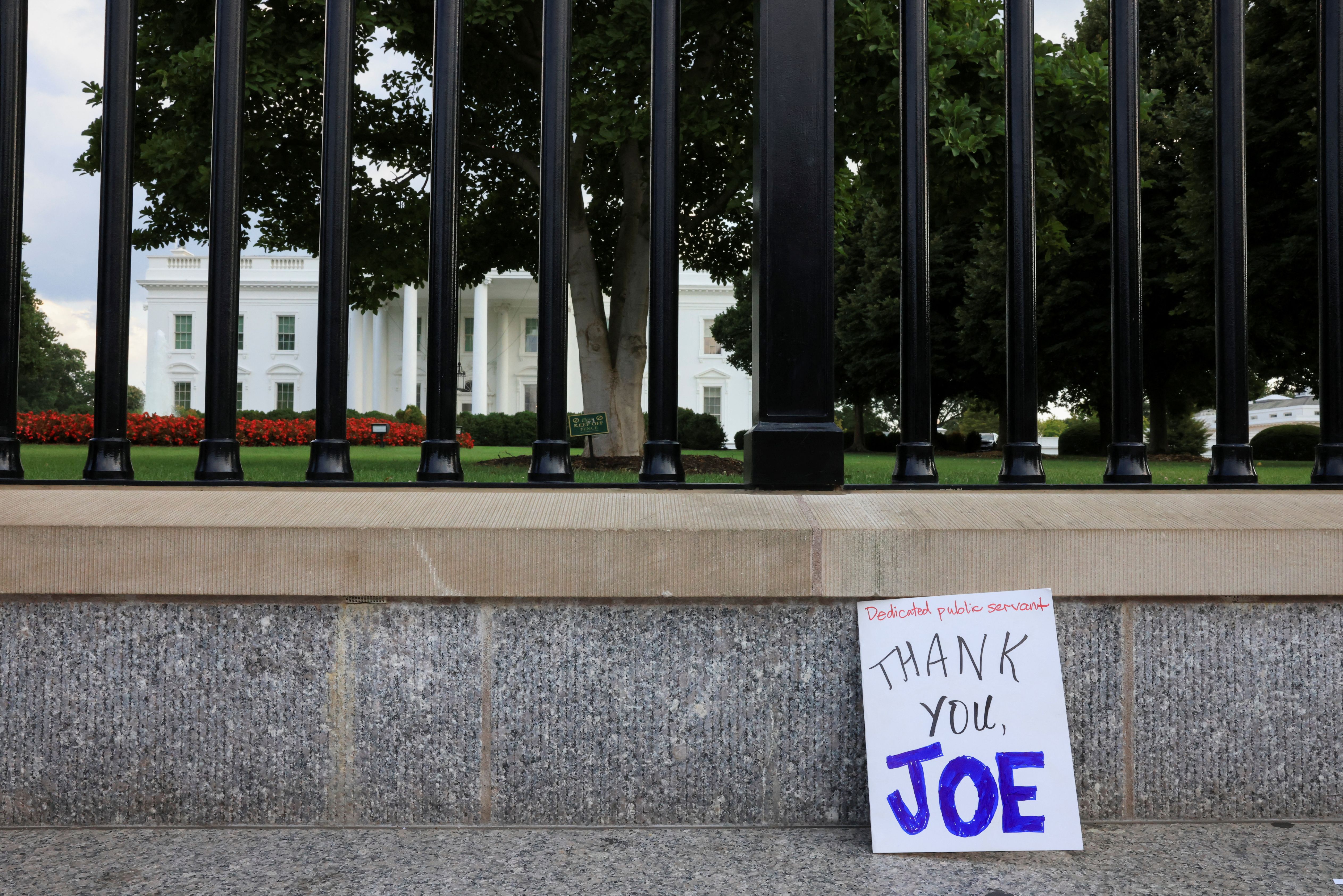 A placard is pictured as people gather outside the White House after U.S. President Joe Biden announced he is stopping his bid for reelection, in Washington, D.C., U.S., July 21, 2024. (Photo by Kevin Mohatt/Reuters)