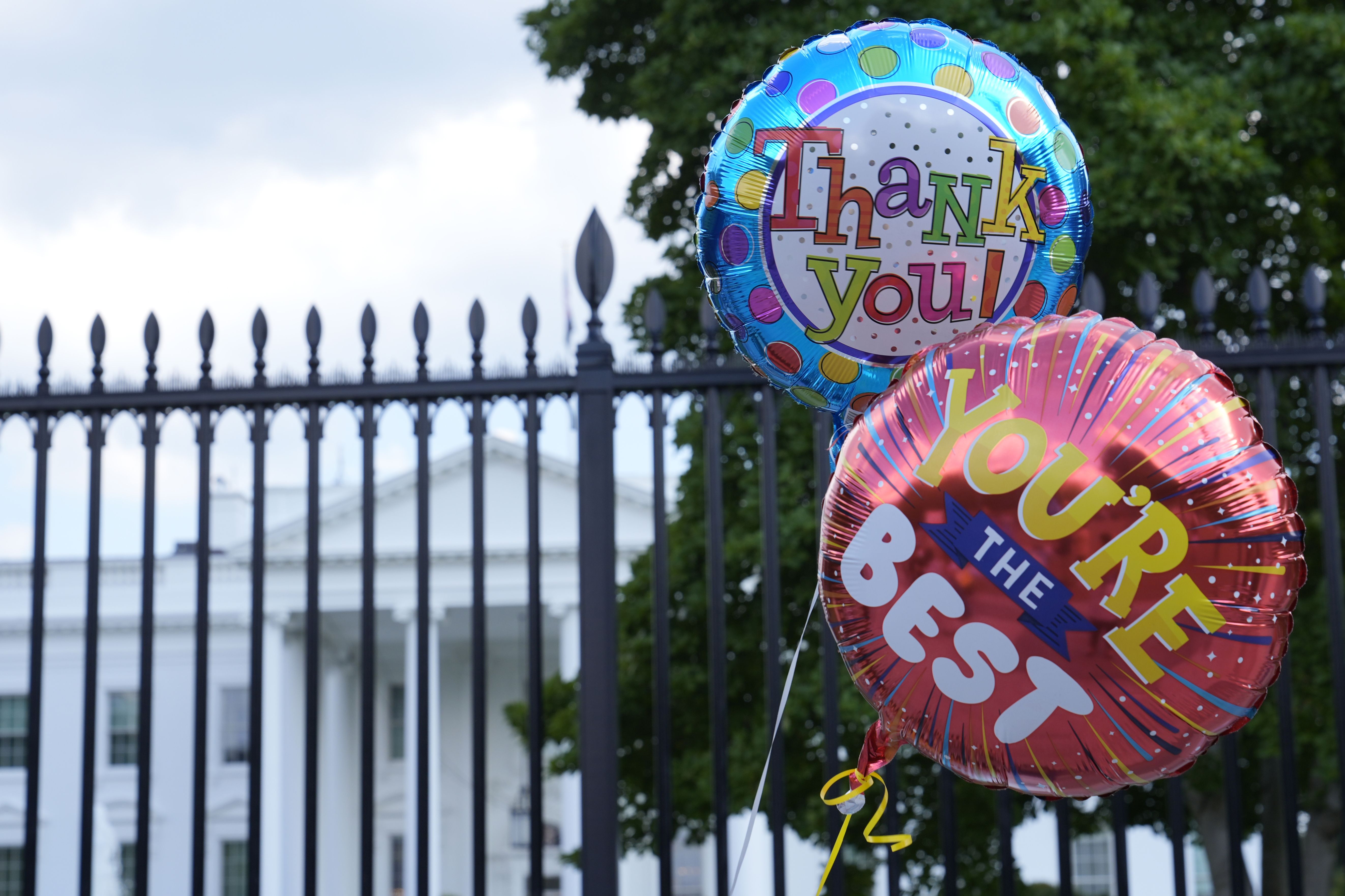 Balloons for President Joe Biden are brought to the White House in Washington, Sunday, July 21, 2024. Biden dropped out of the 2024 race for the White House on Sunday, ending his bid for reelection following a disastrous debate with Donald Trump that raised doubts about his fitness for office just four months before the election. (Photo by Susan Walsh/AP Photo)