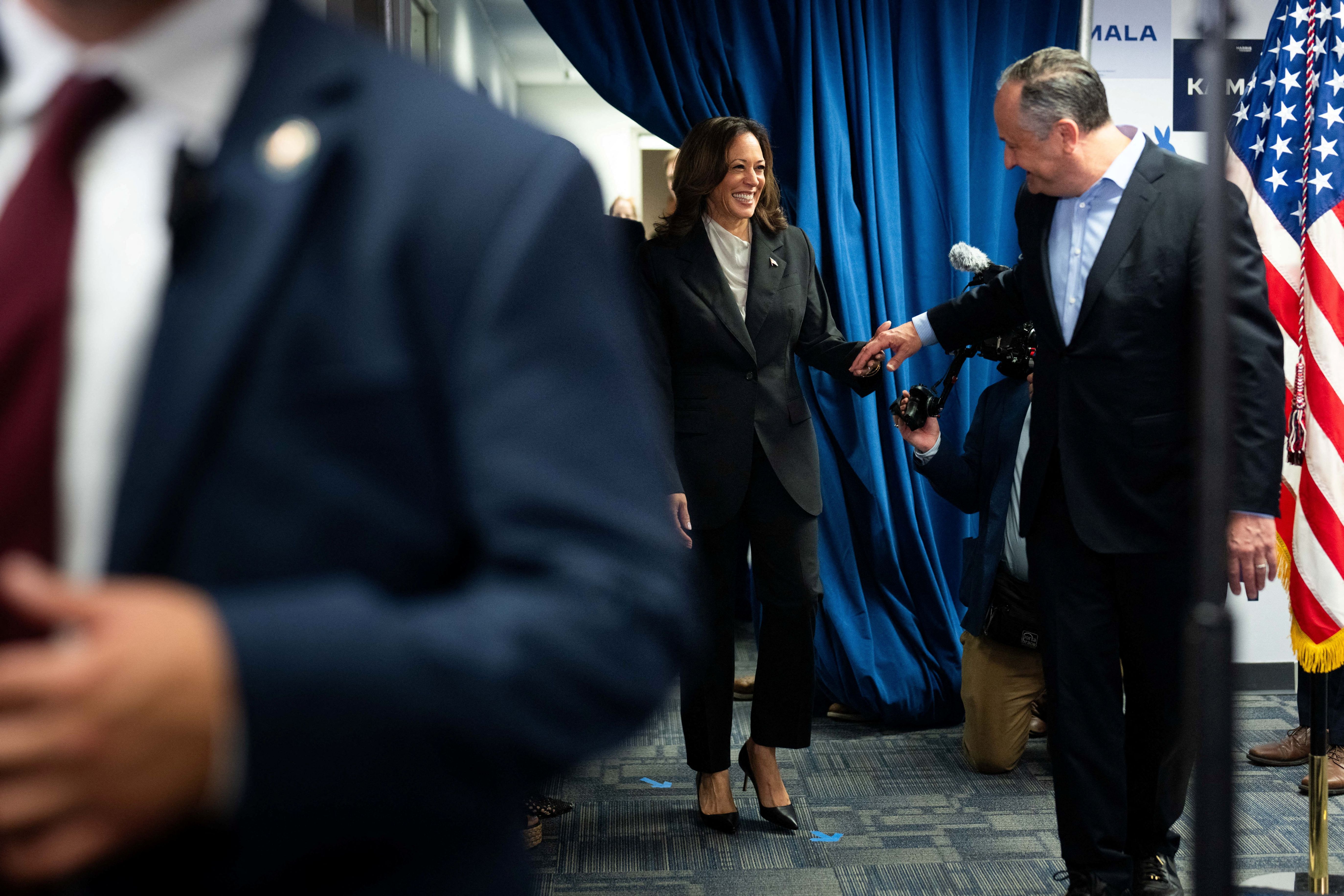 Second Gentleman Douglas Emhoff greets his wife US Vice President and Democratic presidential candidate Kamala Harris as she walks out to speak to campaign staff at her Presidential Campaign headquarters in Wilmington, Delaware on July 22, 2024. Harris on January 22, won the crucial backing of Democratic heavyweight Nancy Pelosi to lead the party against Donald Trump in November after Joe Biden's stunning exit from the 2024 race. As the endorsements stacked up, the 59-year-old Harris made her first public appearance since Biden's announcement in a ceremony at the White House where she warmly praised the outgoing president's “unmatched” achievements. (Photo by Erin Schaff/AFP Photo)