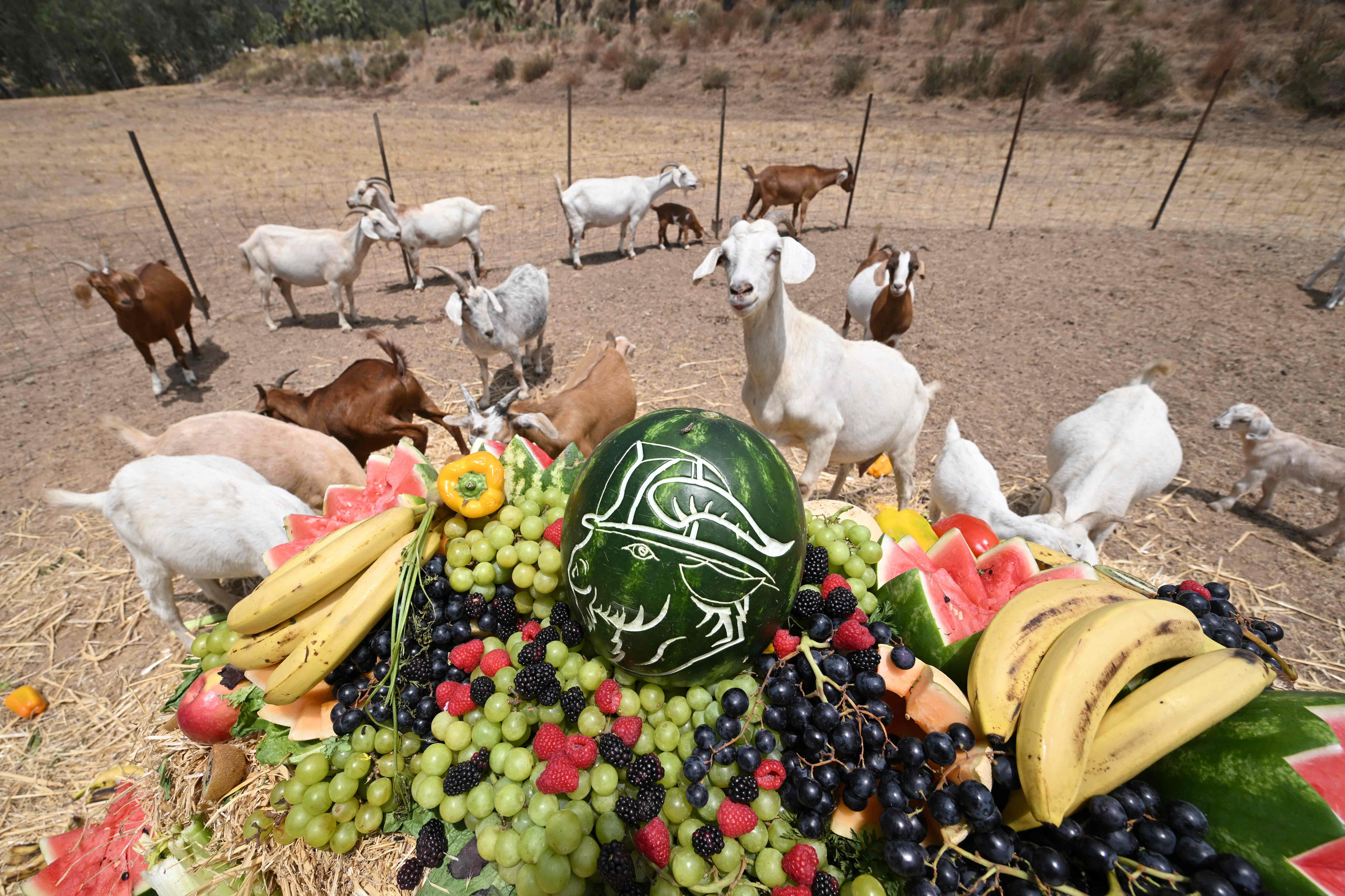 Mother and baby goats who have been on fire prevention duty, eating brush and grass vegetation to prevent the spread of potential wildfires on the land of the indigenous San Manuel Band of Mission Indians, get a “thank you” for their work in the form of a “cake” of fruits, vegetables and grains, on July 23, 2024 at a media opportunity on the tribe's land in San Bernardino, California. The tribe's fire department deploys a herd of hundreds of goats during the dry season to help trim the landscape in a natural and regenerative way that also protects the land from harm that could be caused if heavy equipment was used to remove vegetation. (Photo by Robyn Beck/AFP Photo)