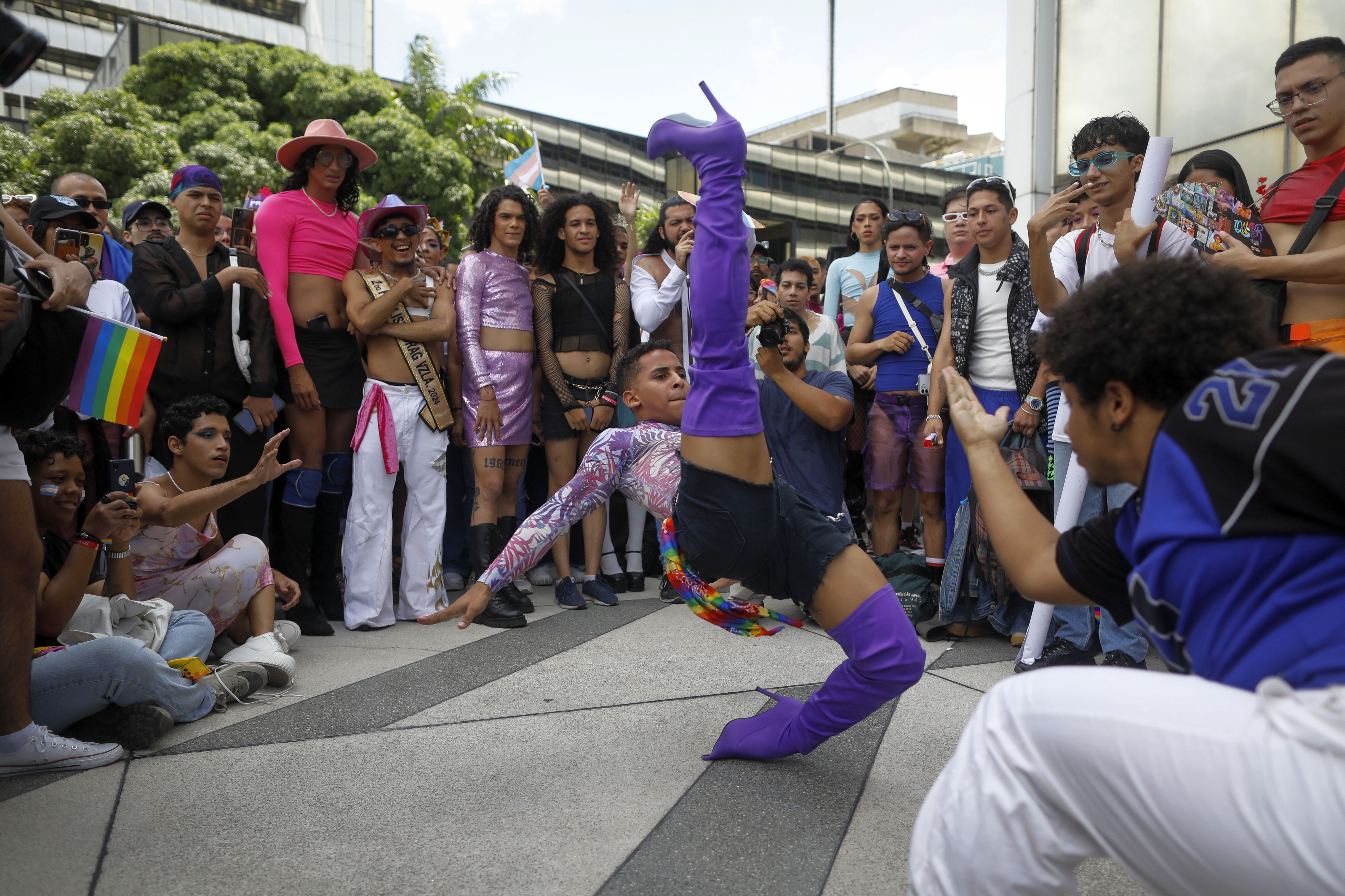A reveler performs during a dance battle in a Gay Pride march in Caracas, Venezuela, Sunday, July 7, 2024. (Photo by Cristian Hernandez/AP Photo)