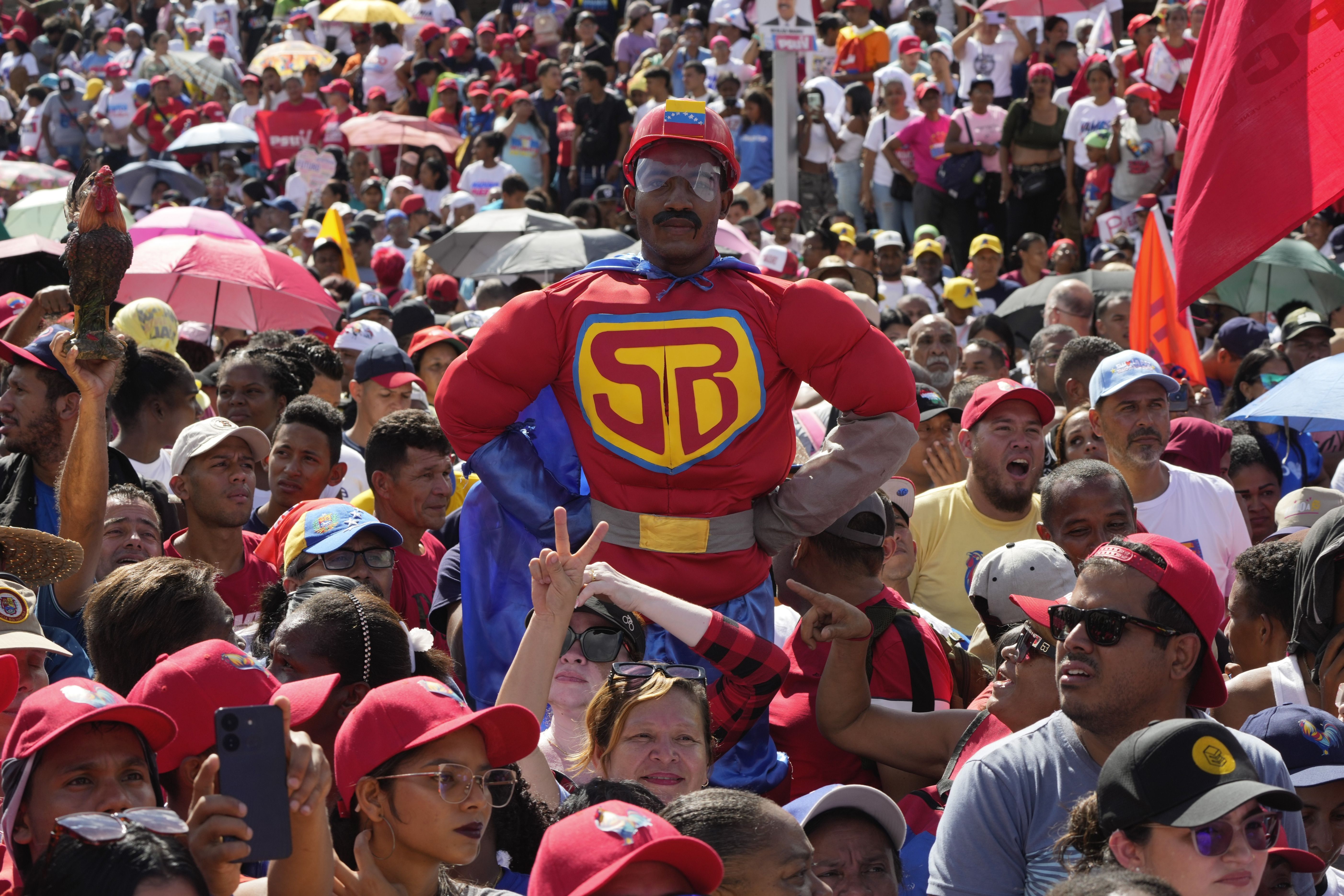 A supporter dressed as “Super Bigote”, a cartoon character depicting Venezuela's President Nicolas Maduro as a superhero, stands above the crowd during a campaign rally, ahead of the upcoming presidential election in Caracas, Venezuela, July 18, 2024. (Photo by Ariana Cubillos/AP Photo)