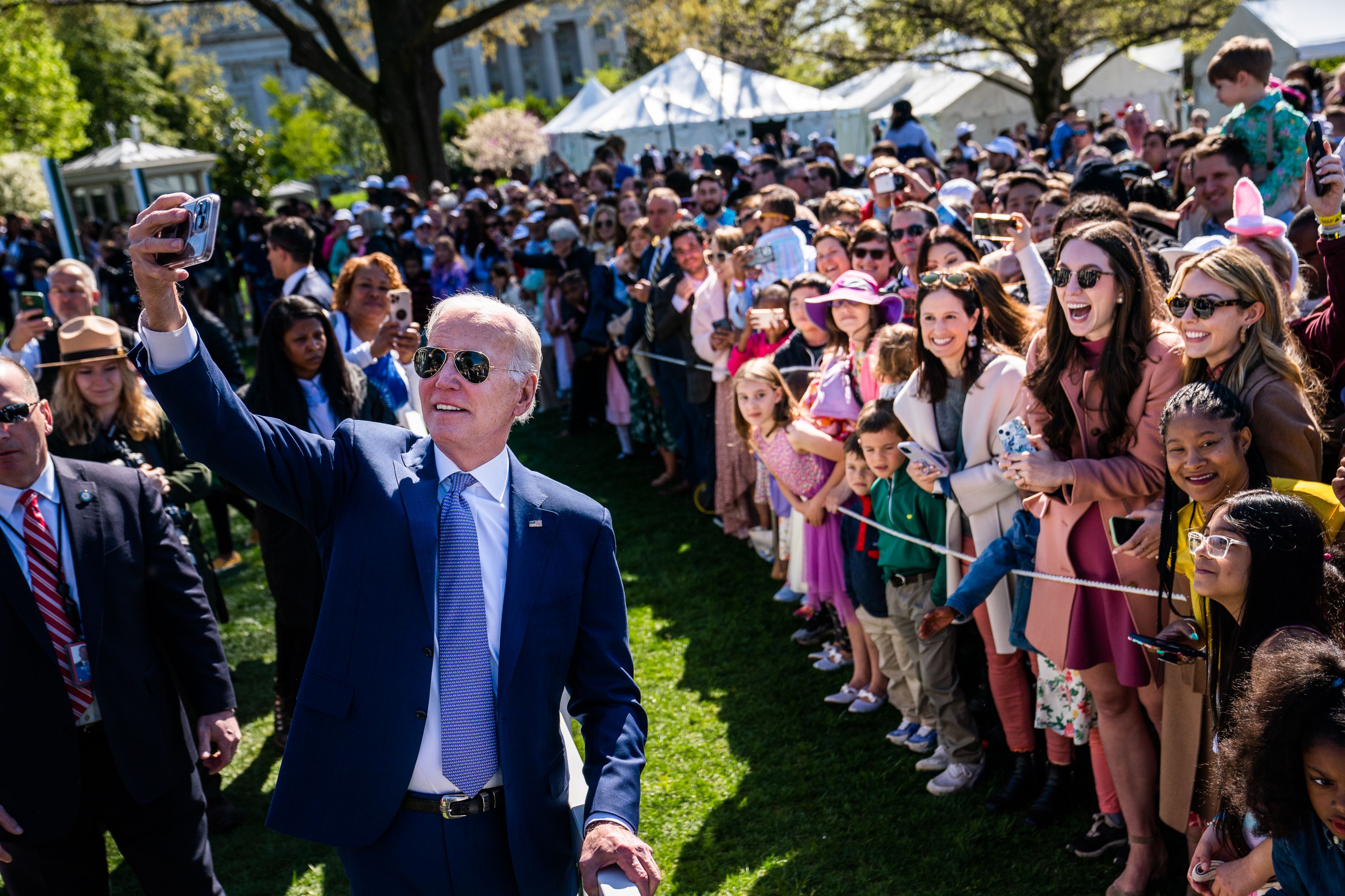 US President Joe Biden greet guest and take selfies during the 2023 White House Easter Egg Roll on the South Lawn of the White House on Monday, April 10, 2023. (Photo by Demetrius Freeman/The Washington Post)