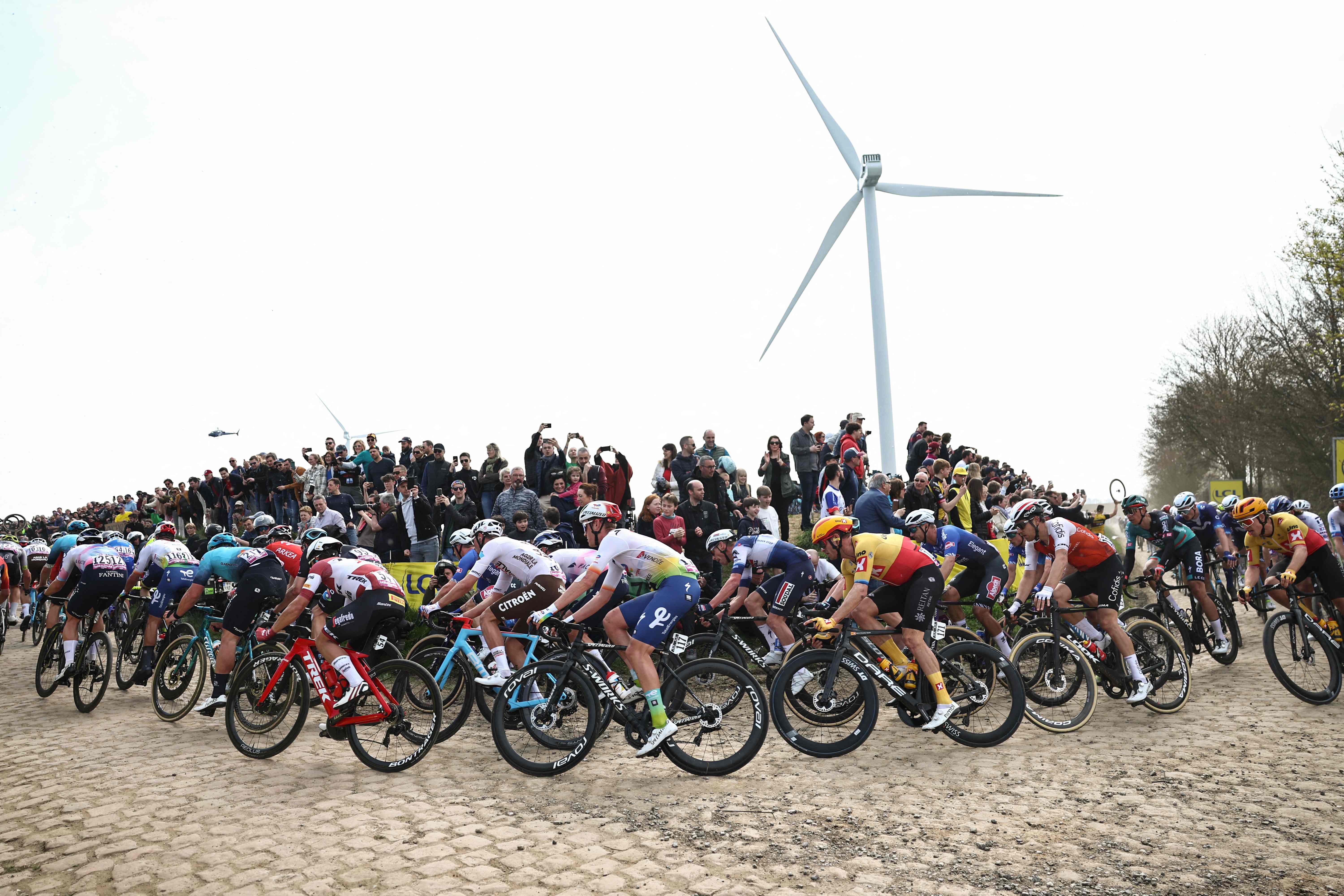 The pack of riders cycles over a cobblestone sector during the 120th edition of the Paris-Roubaix one-day classic cycling race, between Compiegne and Roubaix, northern France, on April 9, 2023. (Photo by Anne-Christine Poujoulat/AFP Photo)