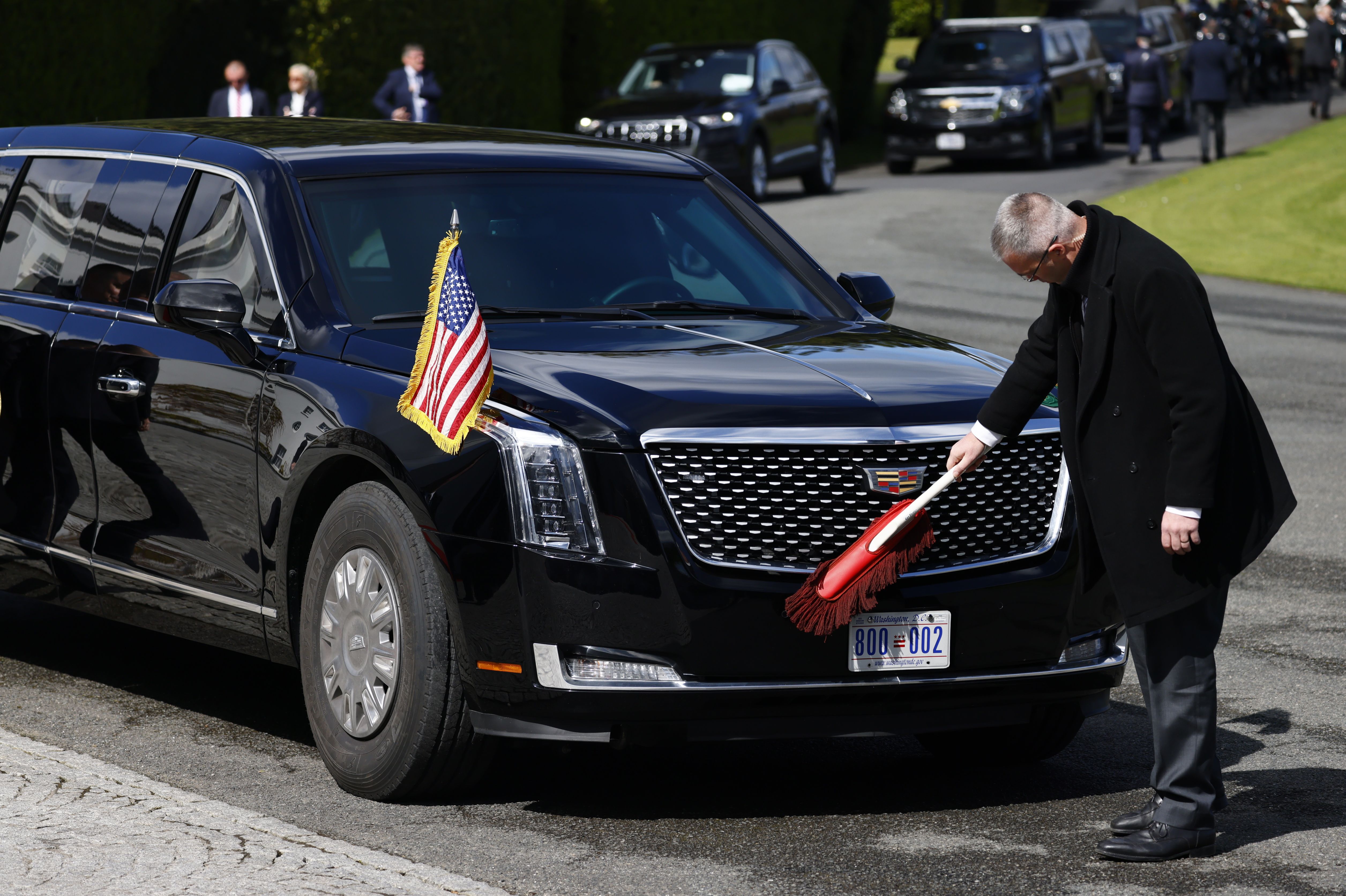 A person cleans The Beast, the US President's official car at Aras an Uachtarain, Residence of the President of Ireland, in Phoenix Park, Dublin, Ireland on April 13, 2023. This is the second day of a four-day visit by President Biden to Northern Ireland and the Republic of Ireland to mark the 25th anniversary of the Good Friday Agreement. (Photo by Tolga Akmen/EPA/EFE)
