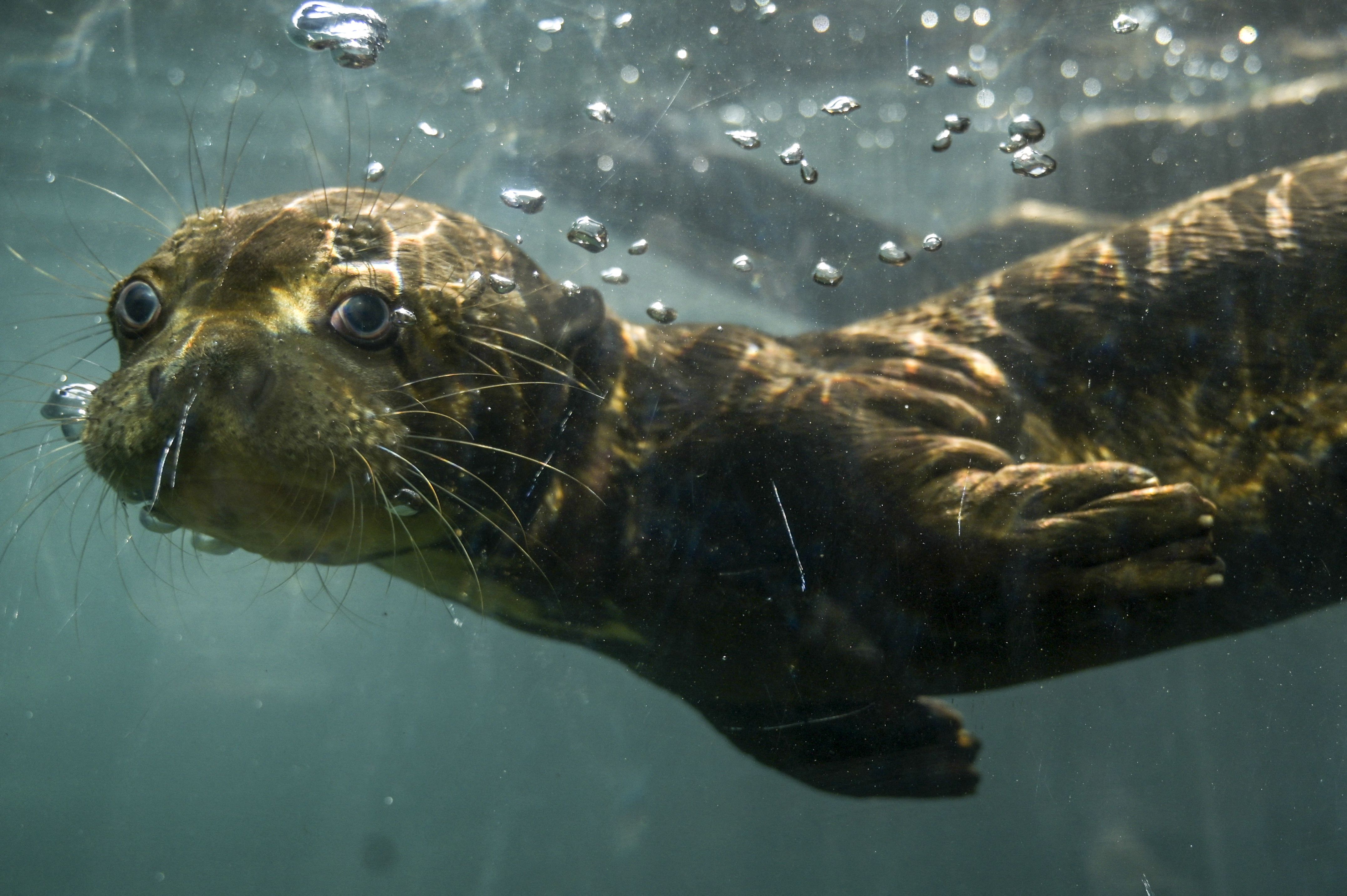 A three-month-old giant otter (Pteronura brasiliensis) swims at the Cali Zoo in Cali, Colombia, on February 13, 2024. (Photo by Joaquin Sarmiento/AFP Photo)
