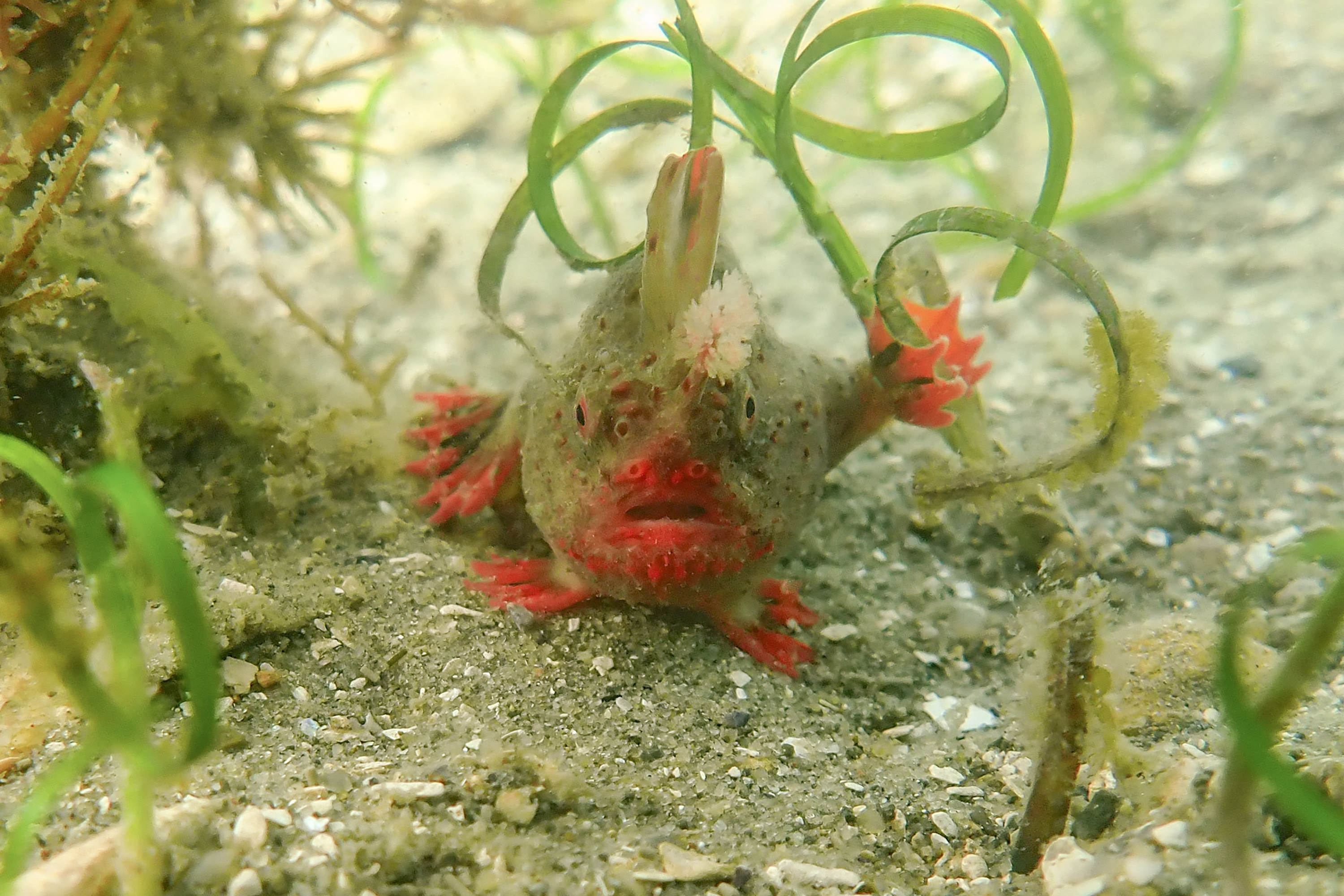 This handout photo taken on January 15, 2024 and released on January 31 by the University of Tasmania's Institute for Marine and Antarctic Studies shows a critically endangered red handfish in waters off Australia's Tasmania state. Scientists have plucked twenty-five exceedingly rare red handfish from the ocean off Tasmania, hoping to protect the struggling species from rising sea temperatures, human-caused habitat changes and ravenous urchins. (Photo by Jemina Stuart-Smith/University of Tasmania/AFP Photo)