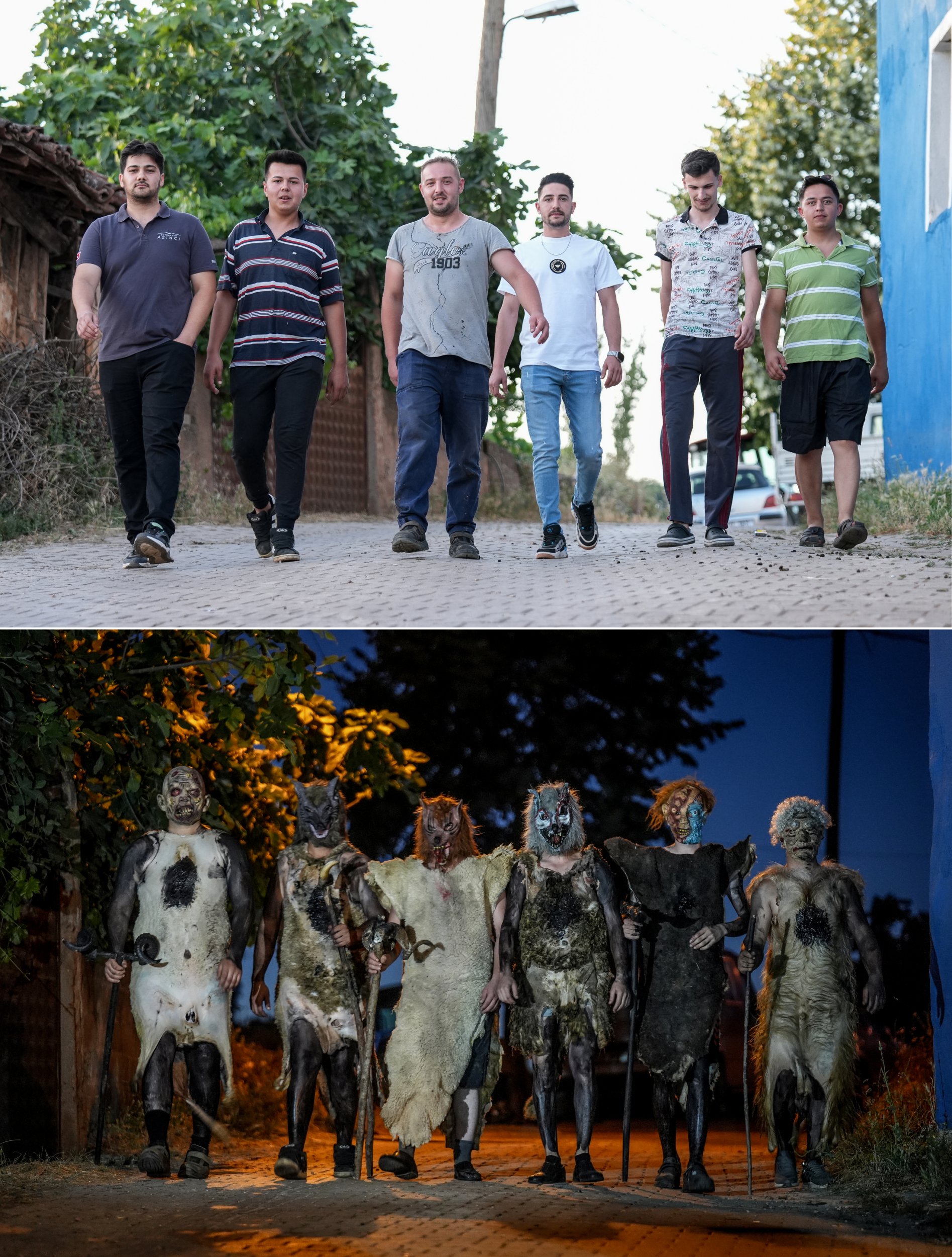 A composite image assembled of two photos showing people without costumes (top) and people with heads, tails, horns and bones from the animals they sacrifice on the Feast of Sacrifice costumes (bottom), in order to keep alive the memory of the military unit named “Deliler” in the Ottoman period, and they continue the tradition of “Alabas”, has been carried on for nearly 2 centuries, in Mustafakemalpasa district of Bursa, Turkiye on June 17, 2024. Residents of the rural Sehriman Neighborhood of the district turn the skins, heads, tails, horns and bones from the animals they slaughter on the Feast of Sacrifice into costumes. Wearing the costumes, young people suddenly stand in front of people in the neighborhood square and streets in the evening and scare them by making different sounds. (Photo by Sergen Sezgin/Anadolu via Getty Images)