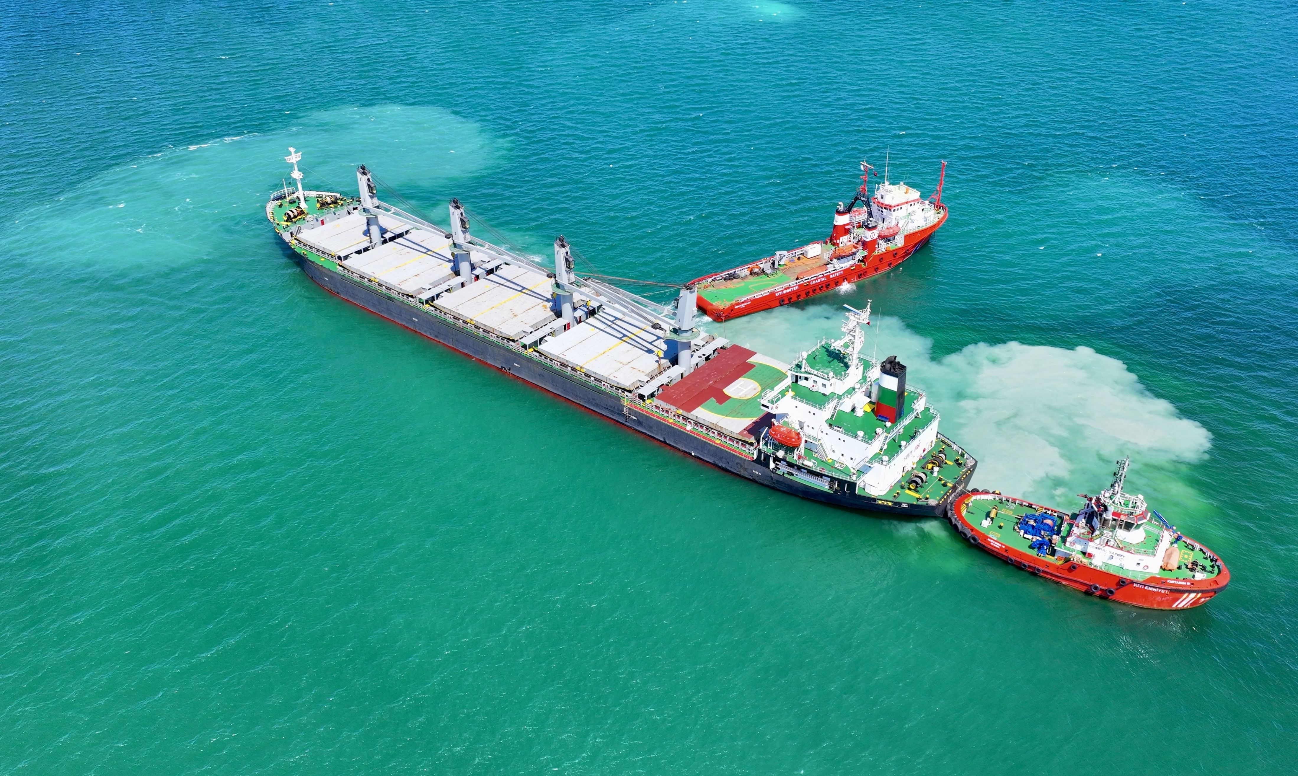 An aerial view of the site as a dry cargo ship that ran aground after anchoring off Yesilkoy, while en route from Russia to Tunisia as the Coastal Safety General Directorate (KEGM) teams continue its rescue operations in Istanbul, Turkiye on June 30, 2024. (Photo by Tayyib Hosbas/Anadolu via Getty Images)
