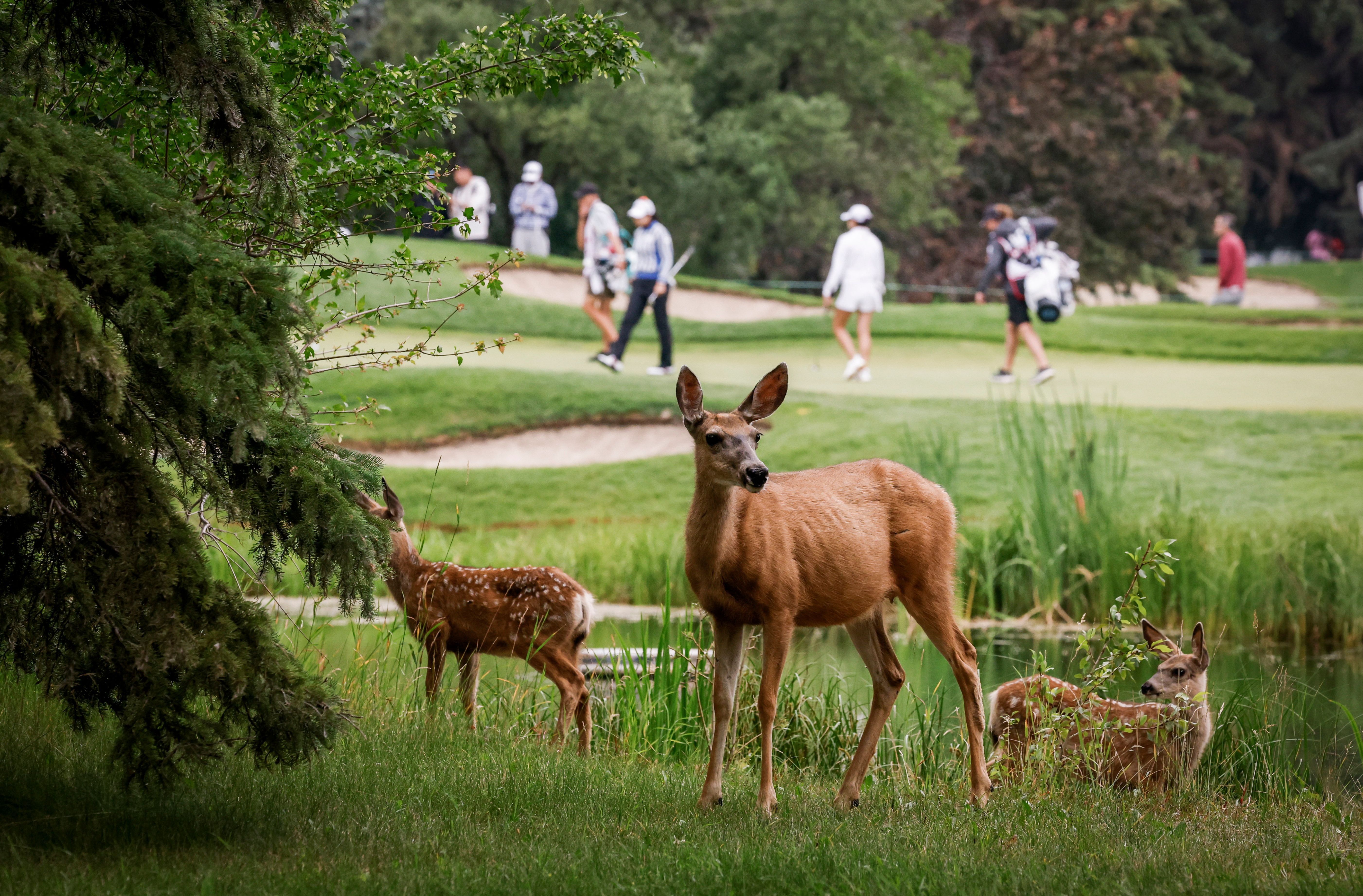 A mule deer doe and her two fawns graze as golfers pass by during the first round at the LPGA Canadian Women's Open golf tournament in Calgary, Alta., Thursday, July 25, 2024. (Photo by Canadian Press/Rex Features/Shutterstock)