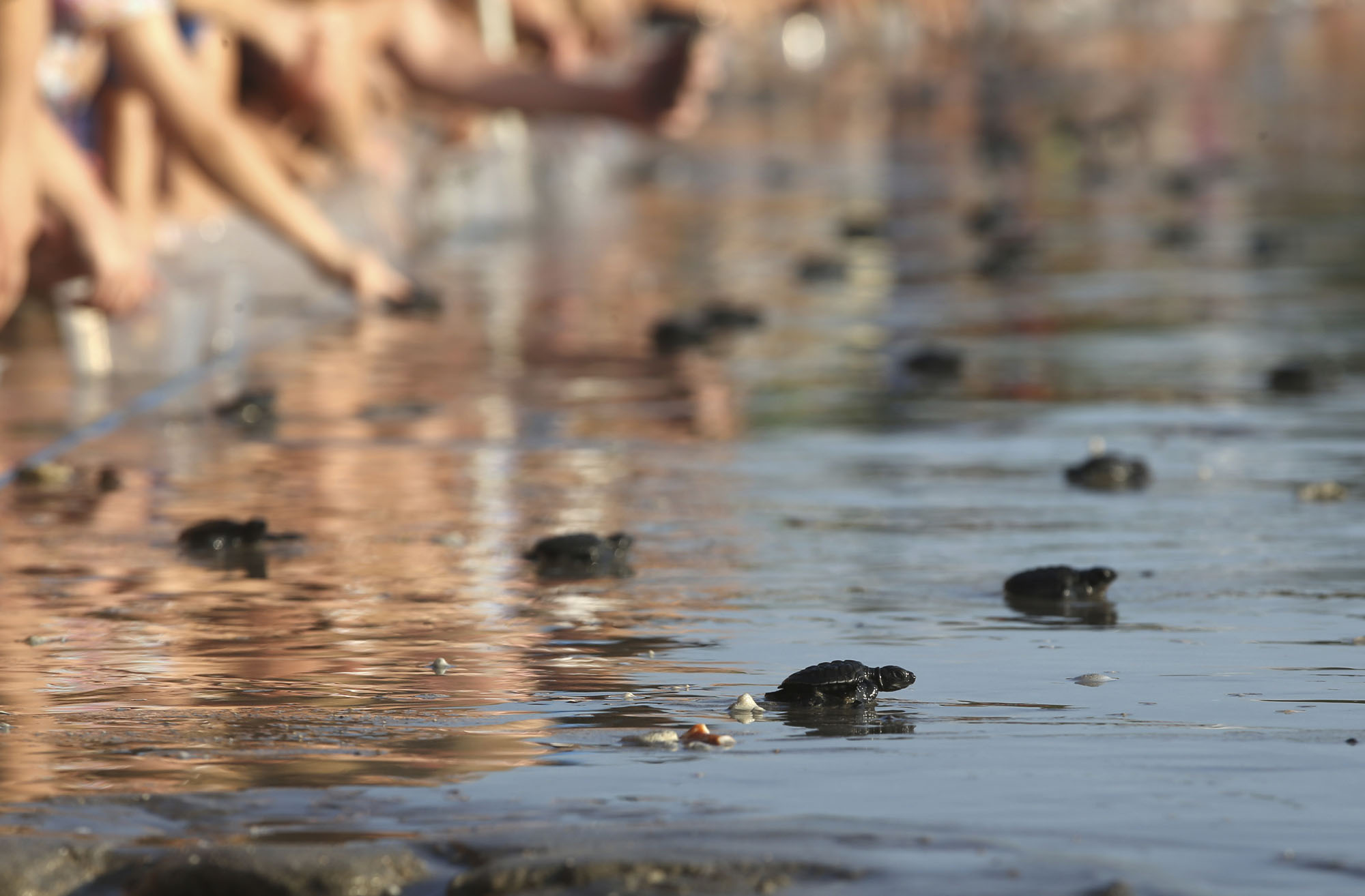 Baby sea turtles are released into the ocean from Kuta beach, Bali, Indonesia on Tuesday, July 23, 2024. About three hundred newly hatched Lekang turtles were released during a campaign to save the endangered sea turtle. (Photo by Firdia Lisnawati/AP Photo)