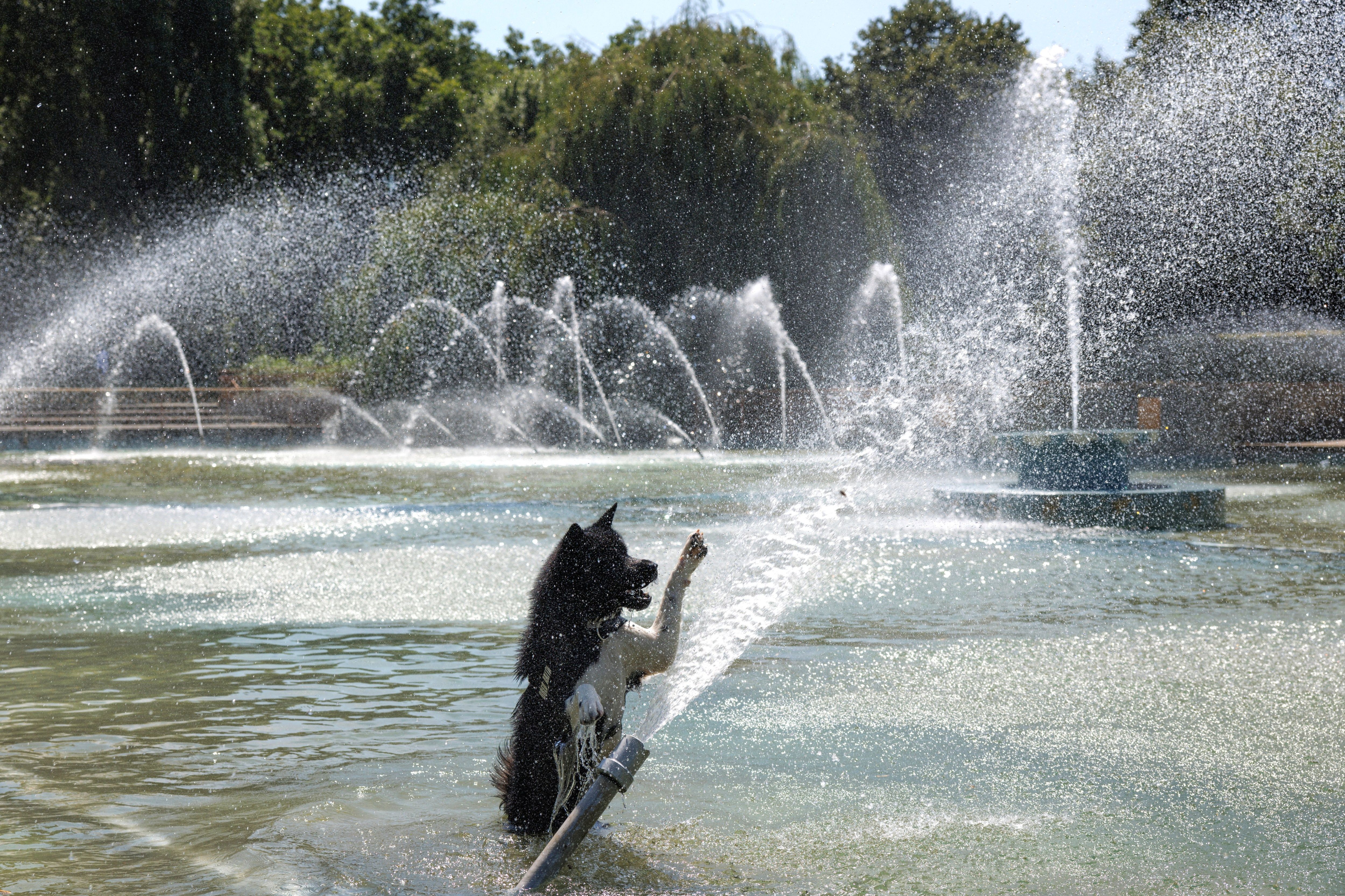 Oreo, the American Akita, Husky Cross plays in the fountains at Battersea Park on July 29, 2024 in London, United Kingdom. The UK Health Security Agency (UKHSA) issued a yellow heat-related health warning for much of England this week as temperatures are expected to hit 32C on Tuesday. (Photo by Dan Kitwood/Getty Images)