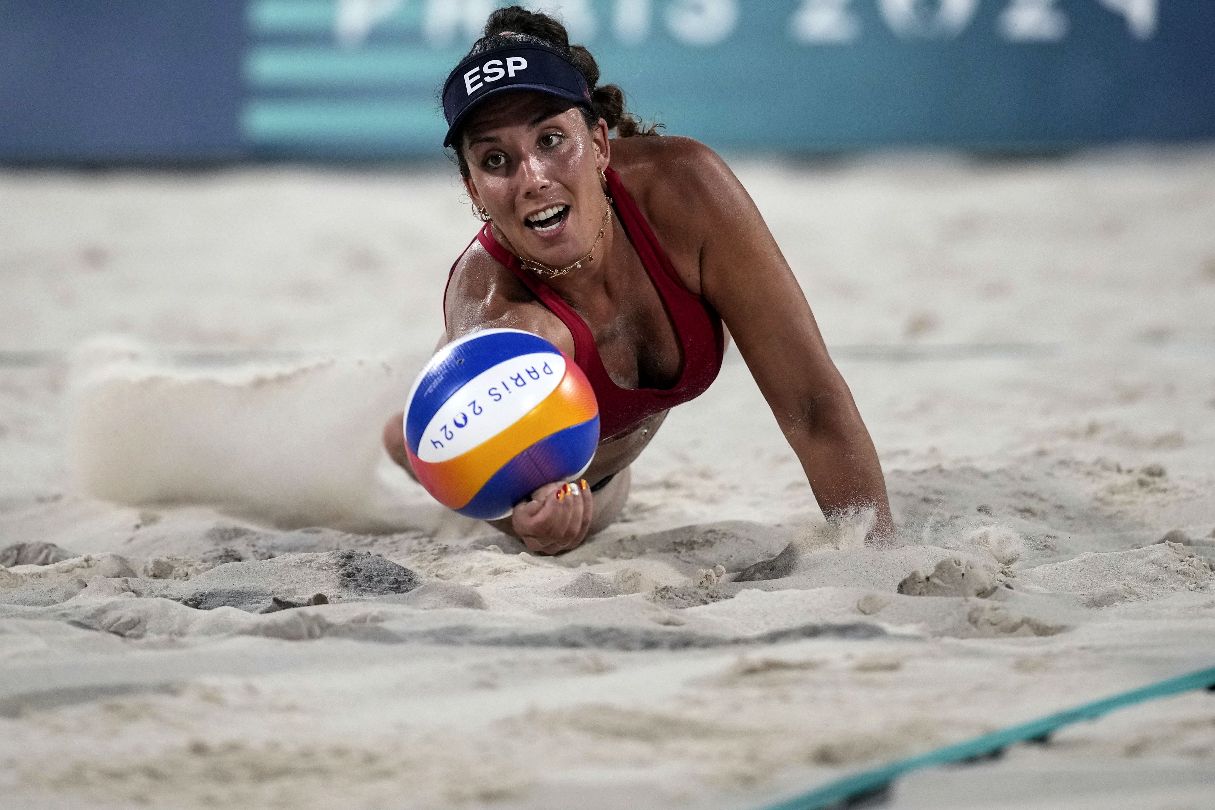 Spain's Paula Soria Gutierrez dives for the ball during the women's pool A beach volleyball match between Brazil and Spain at Eiffel Tower Stadium at the 2024 Summer Olympics, Tuesday, July 30, 2024, in Paris, France. (Photo by Louise Delmotte/AP Photo)