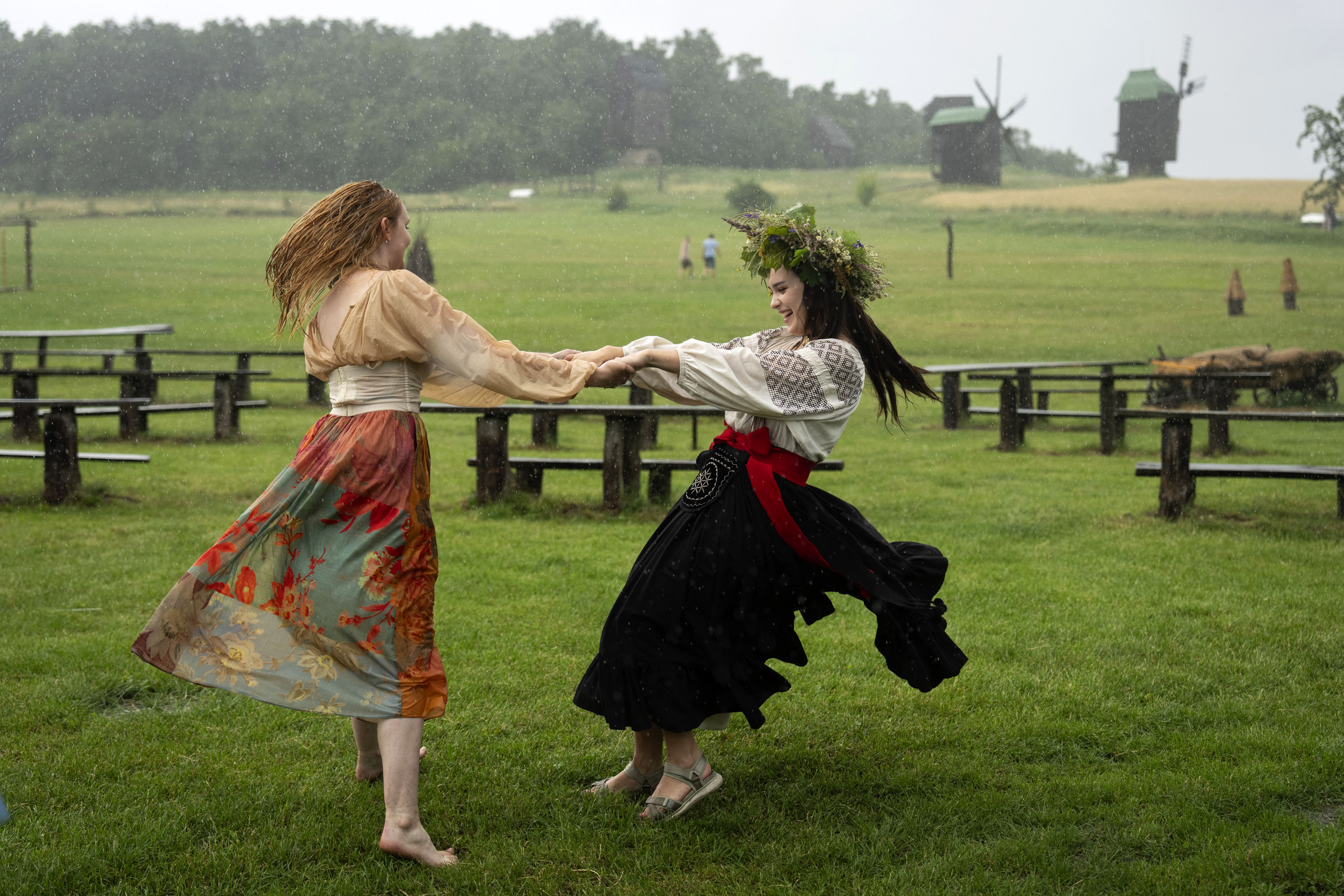 Ukrainian young women dressed in traditional clothing dance under heavy rain at a traditional Midsummer Night celebration near capital Kyiv, Ukraine, Sunday, June 23, 2024. The age-old pagan festival is still celebrated in Ukraine amid the third year of Russia-Ukraine war. (Photo by Efrem Lukatsky/AP Photo)