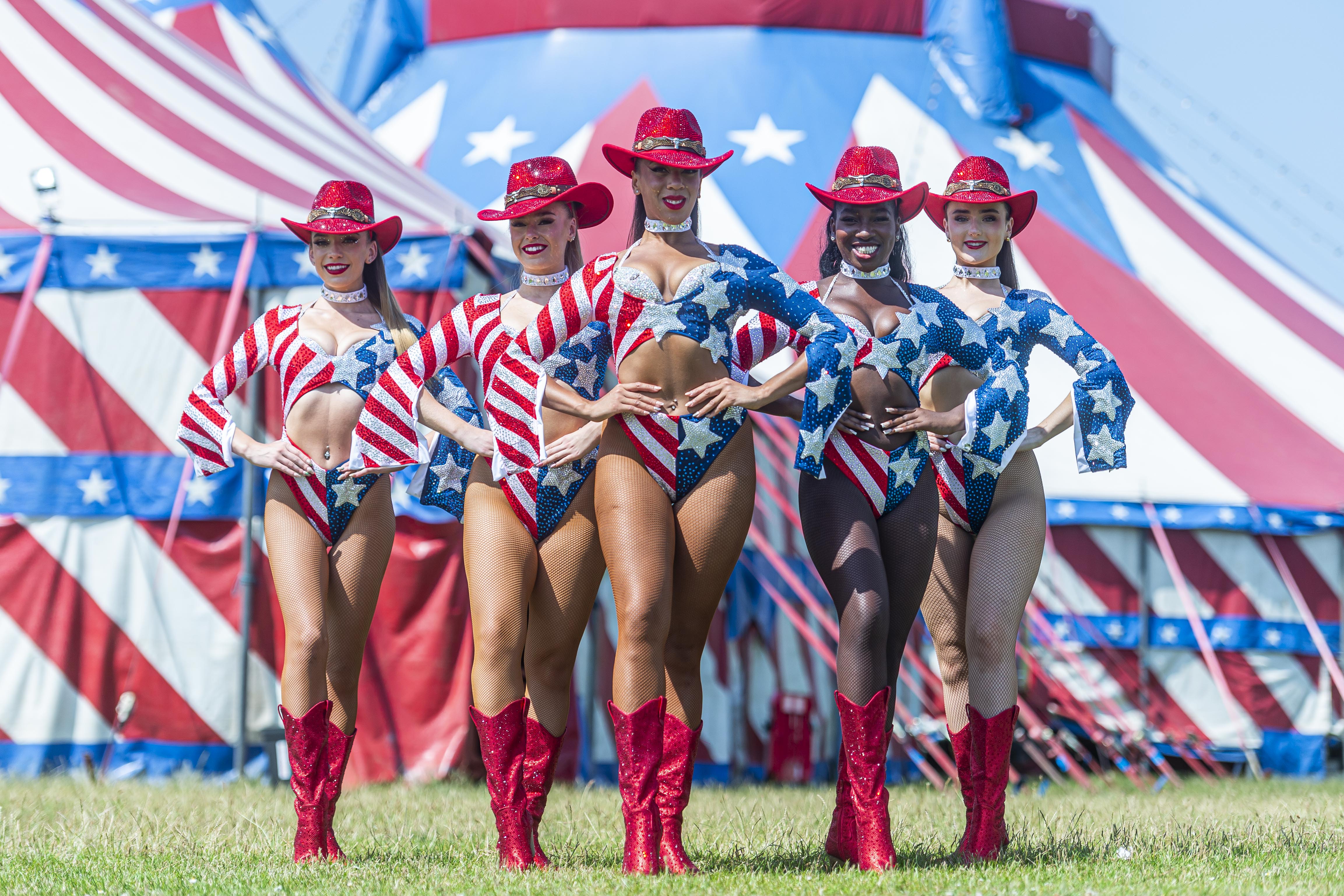 Circus Vegas's nationwide tour comes to town to entertain audiences in a big top tent in Poole, Dorset, UK on August 1, 2024. The show is celebrating 255 years of performances and includes acrobats, daredevils and dance acts. (Phoot by Bournemouth News)