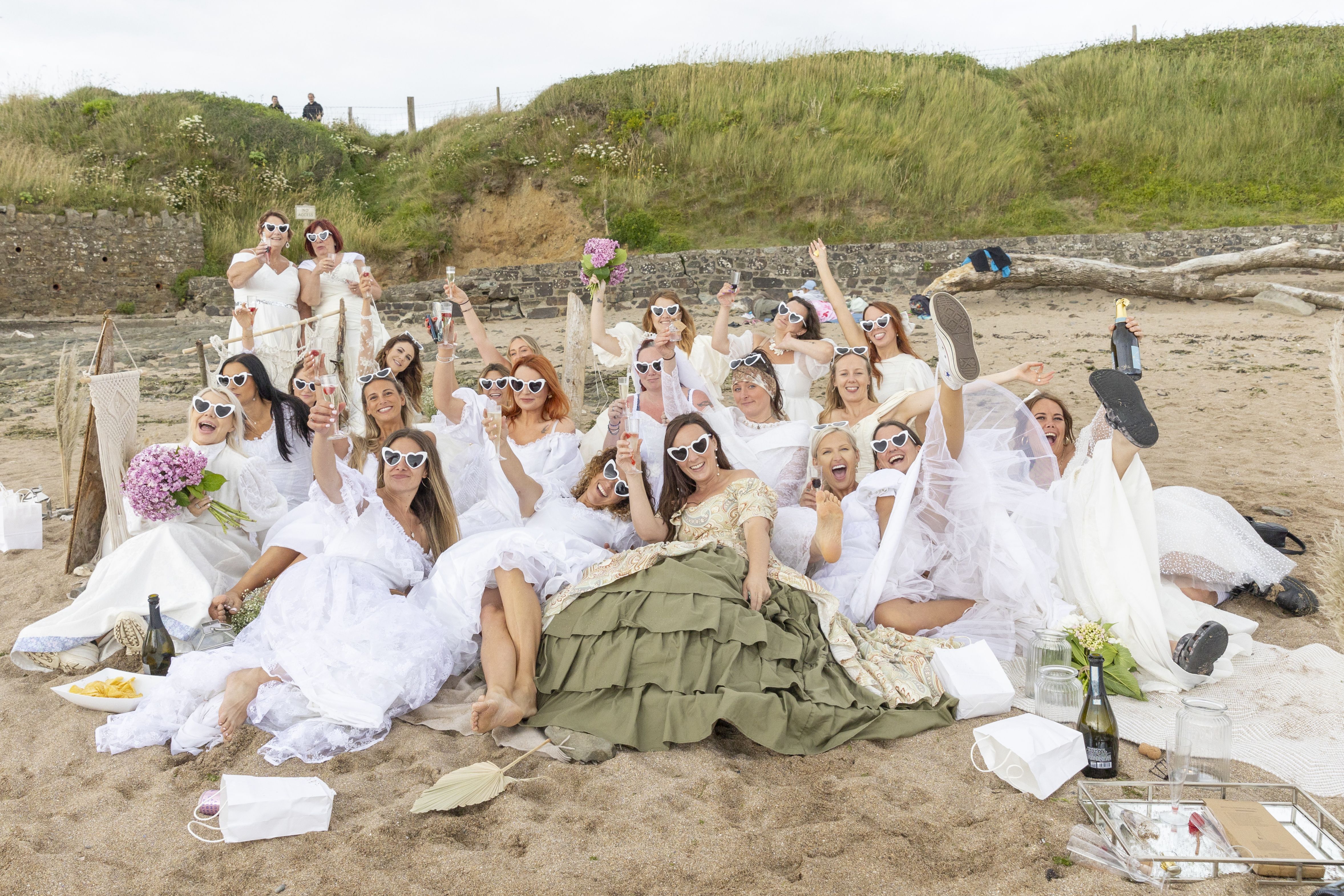 Everyone’s a bride at this hen party in Croyde Bay, North Devon, UK as 22 women hit the beach on July 28, 2024. (Photo by Becky Hutner/Splash News and Pictures)