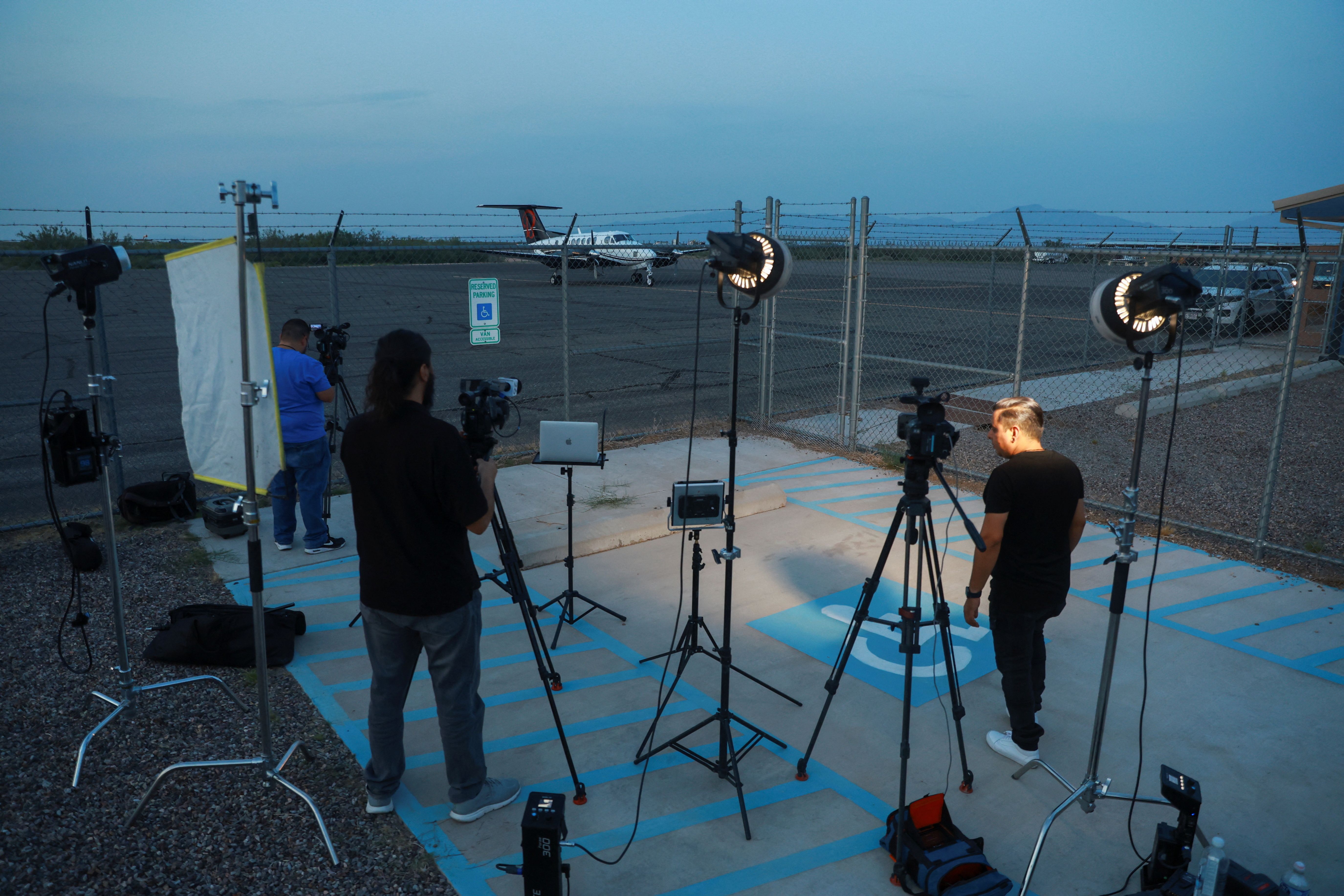 Media personnel stand at Dona Ana County private airport where a plane believed to have carried Mexican drug lord Ismael "El Mayo" Zambada and Joaquin Guzman Lopez, the son of Zambada's former partner, Joaquin “El Chapo” Guzman, who were arrested in El Paso, Texas, is seen on the tarmac, in Santa Teresa, New Mexico, U.S., July 25, 2024. (Photo by Jose Luis Gonzalez/Reuters)