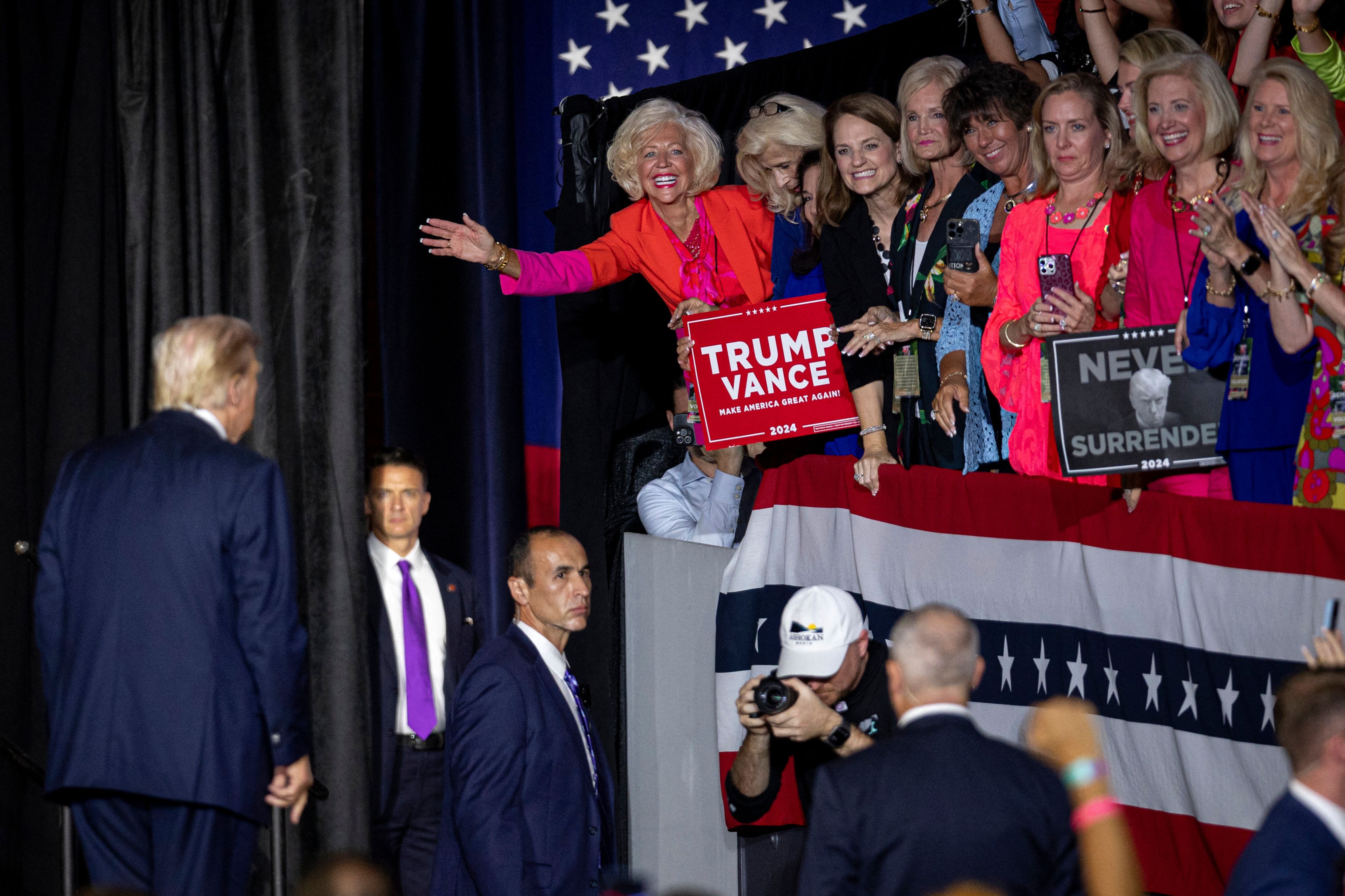 Supporters react as former US President and 2024 Republican presidential candidate Donald Trump takes in the crowd after speaking during a campaign rally at the Bojangles Coliseum in Charlotte, North Carolina, on July 24, 2024. (Photo by Logan Cyrus/AFP Photo)