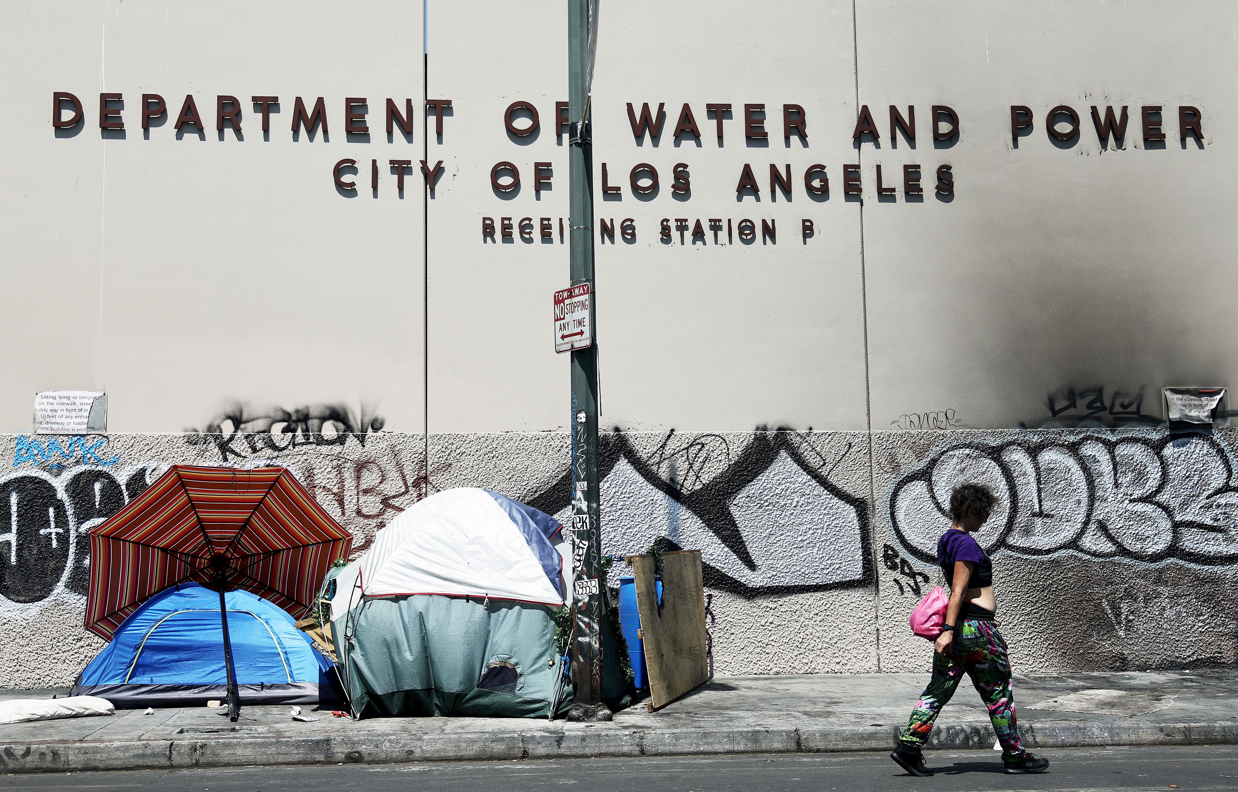 A person walks past an encampment of homeless people in the Skid Row community on July 25, 2024 in Los Angeles, California. California Governor Gavin Newsom issued an executive order for state officials to begin dismantling encampments of Californians who are homeless on the heels of a recent Supreme Court decision. (Photo by Mario Tama/Getty Images)