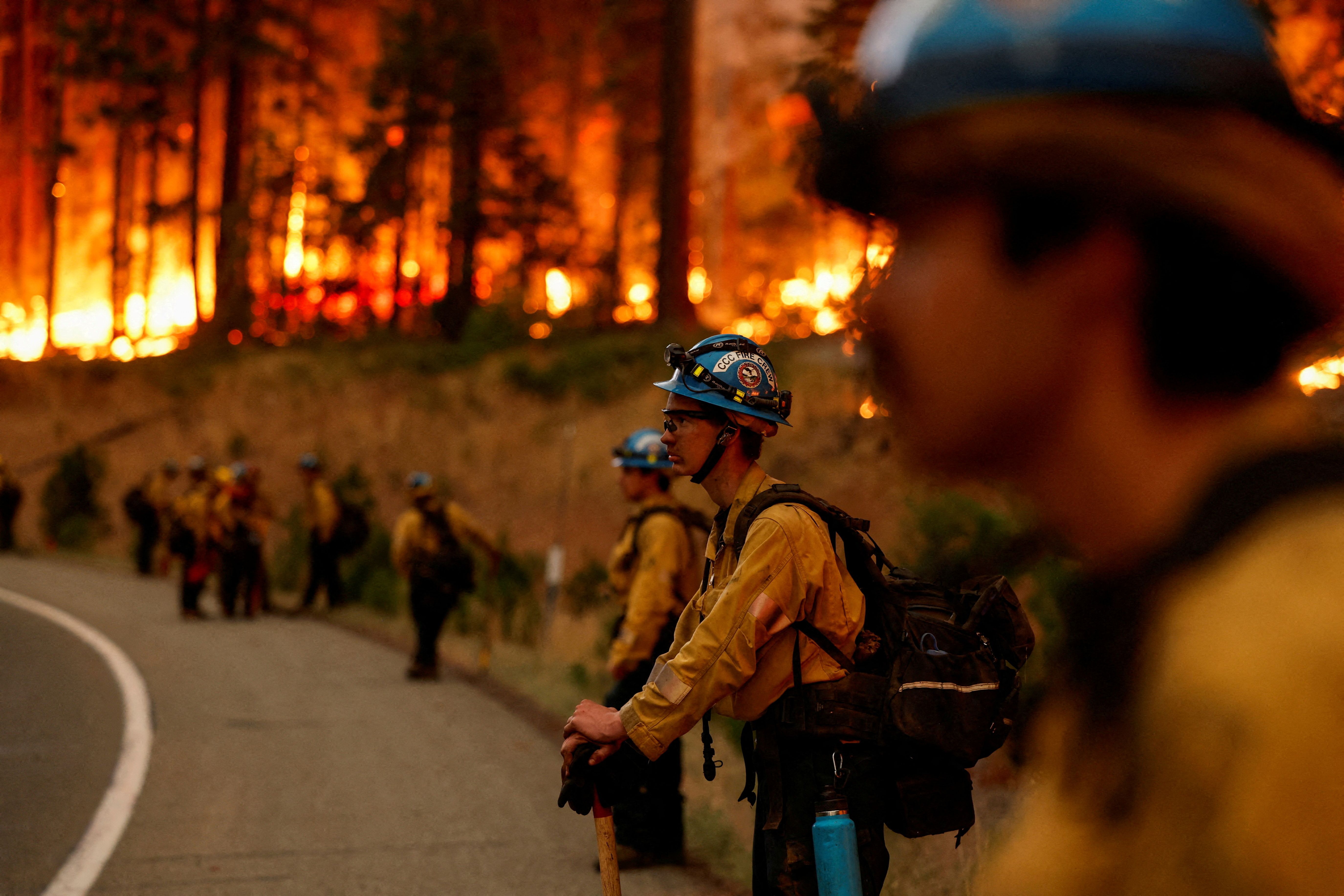 Firefighters stand by the road as the Park Fire burns, near Jonesville, California on July 29, 2024. (Photo by Fred Greaves/Reuters)