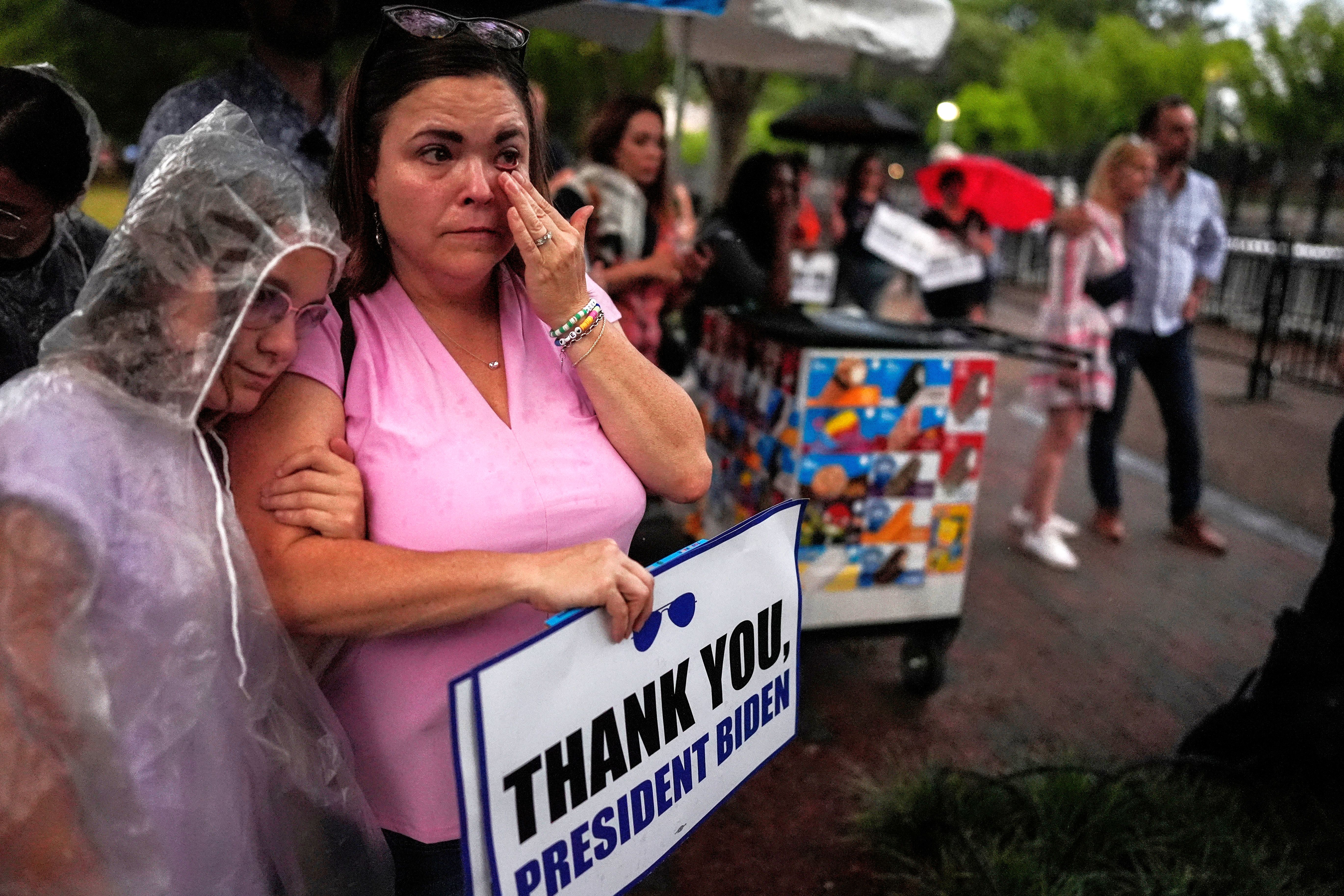 People listen in Lafayette Square to President Joe Biden addressing the nation from the Oval Office of the White House in Washington, Wednesday, July 24, 2024, about his decision to drop his Democratic presidential reelection bid., Wednesday, July 24, 2024, in Washington. (Photo by Mike Stewart/AP Photo)