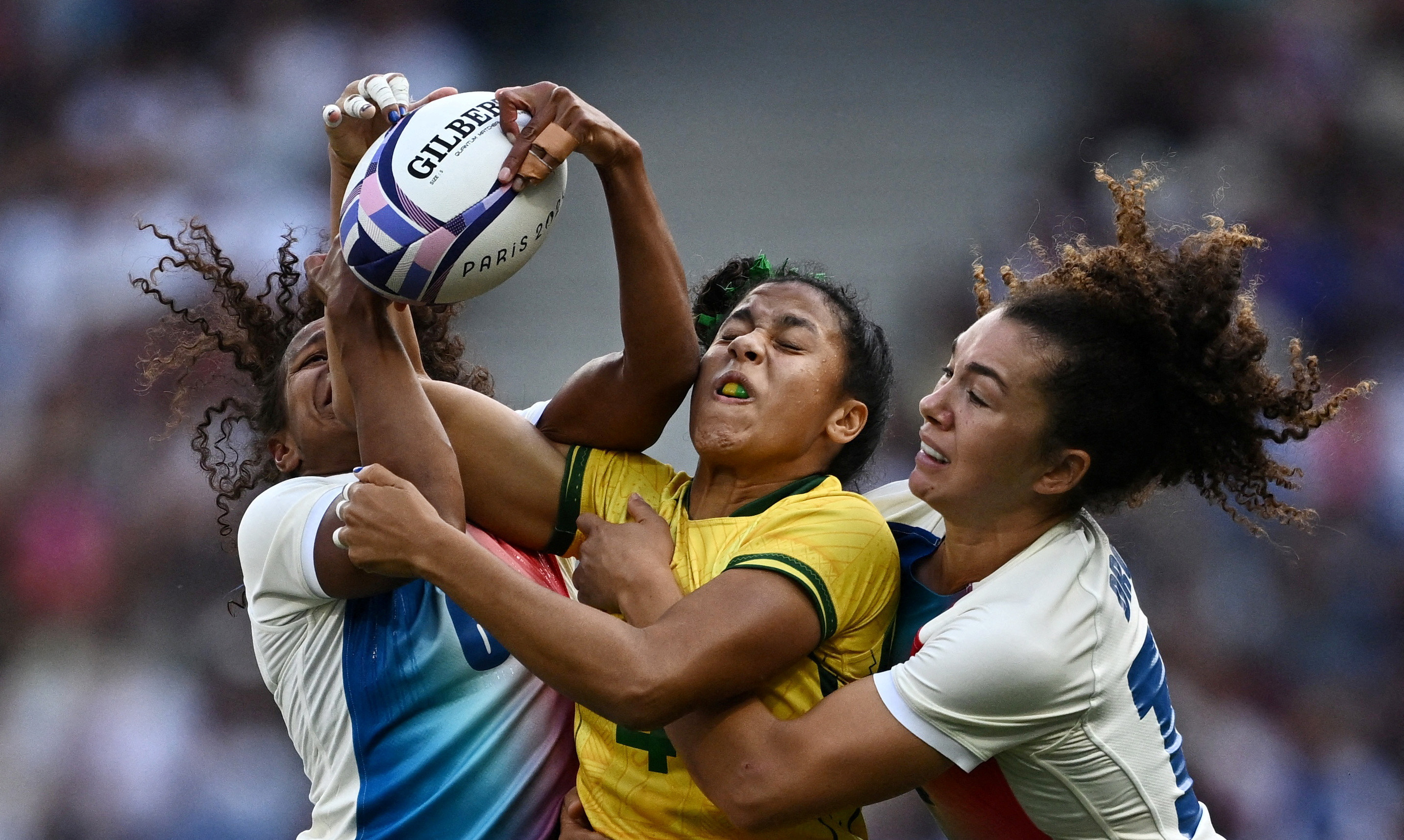 Gisele Gomes Dos Santos of Brazil in action with Yolaine Yengo of France during their women's rugby seven match on July 28, 2024. (Photo by Dylan Martinez/Reuters)